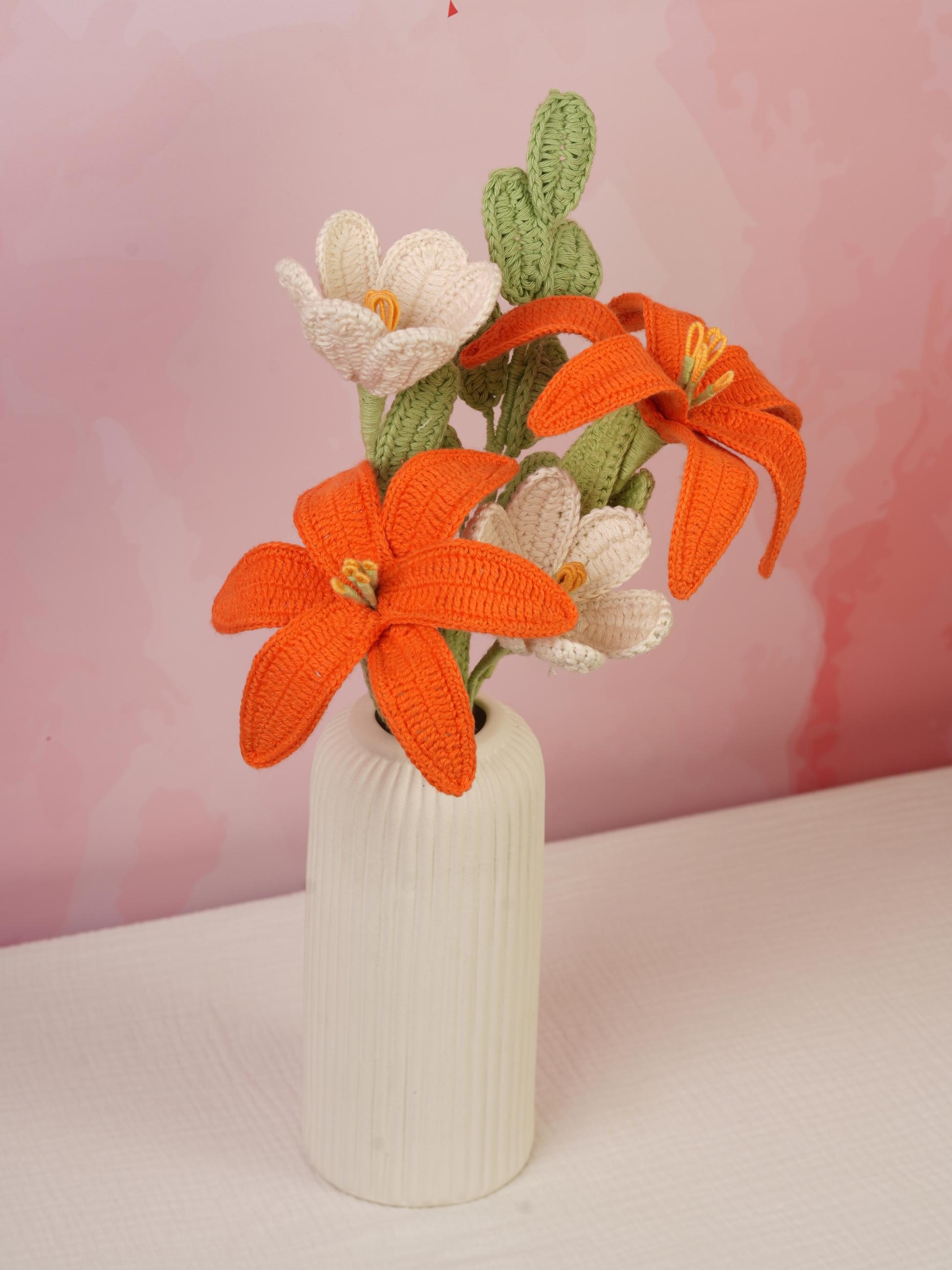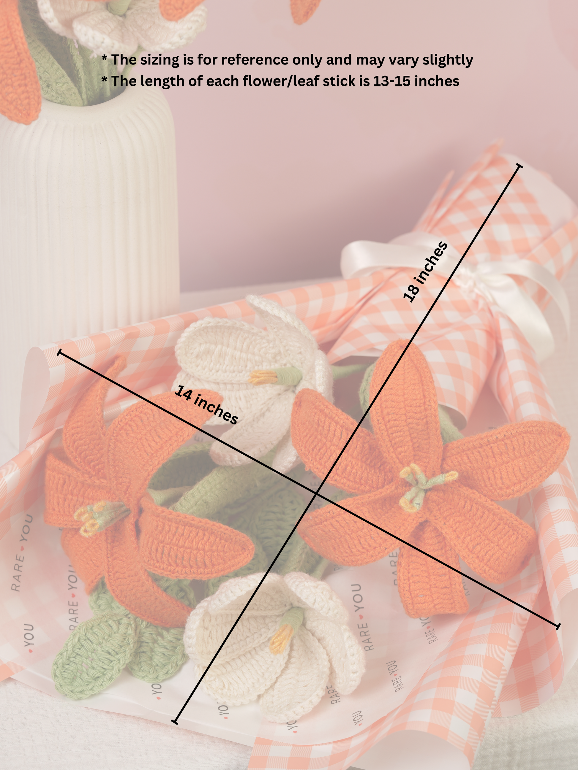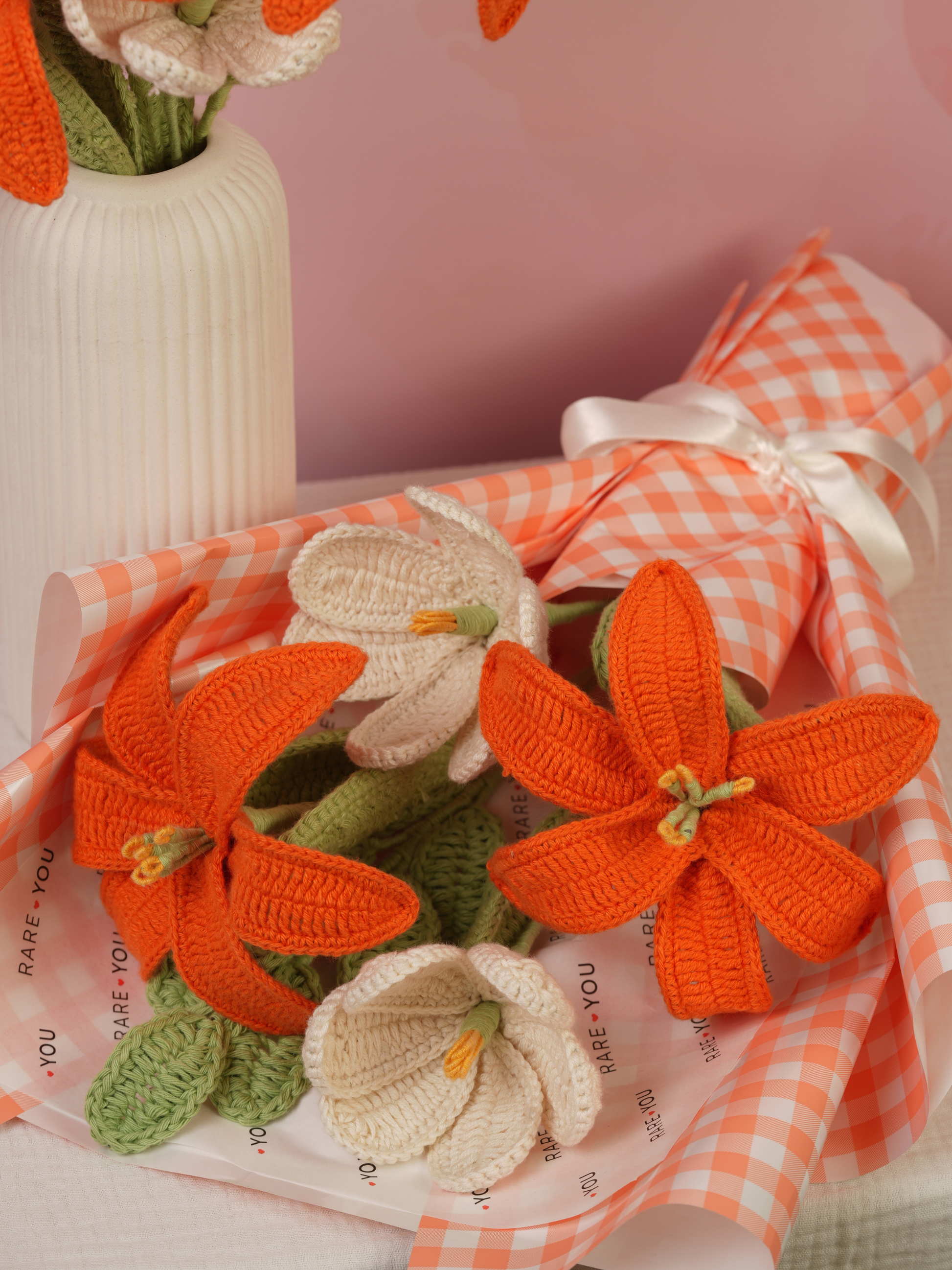 A stunning mix of two bright orange lilies and two off-white open tulips, finished with a leafy stem and wrapped in an elegant orange gingham wrap. Available as a bouquet or arranged in a vase. The colours blend beautifully, giving the whole piece a sophisticated yet cheerful feel.