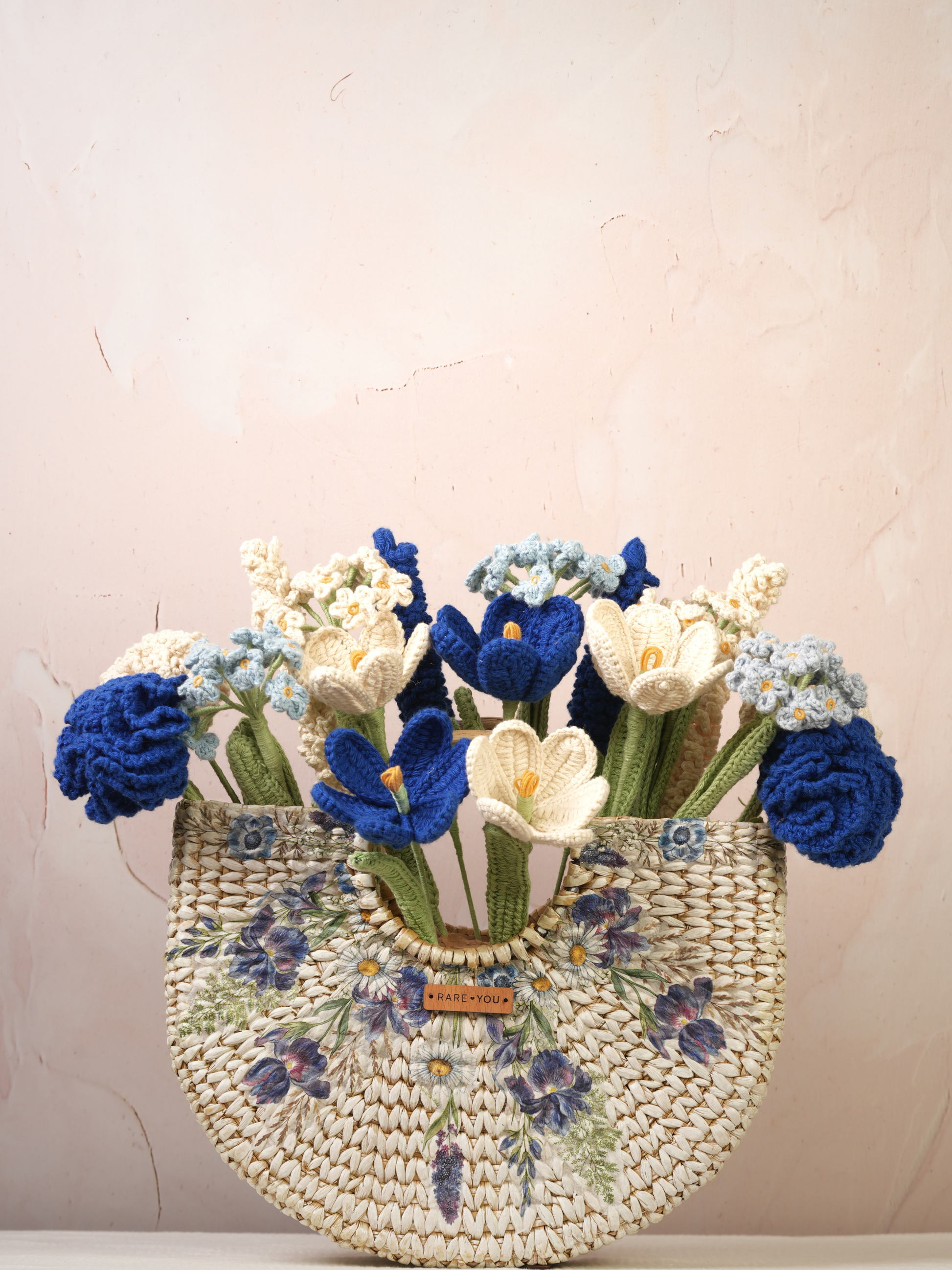 One of our bestsellers, this basket arrangement brings together an exotic blend of tulips, carnations, forget-me-nots, and lavenders. The blue and white colour palette adds a dreamy, calming vibe, perfectly balanced in a beautifully printed basket.