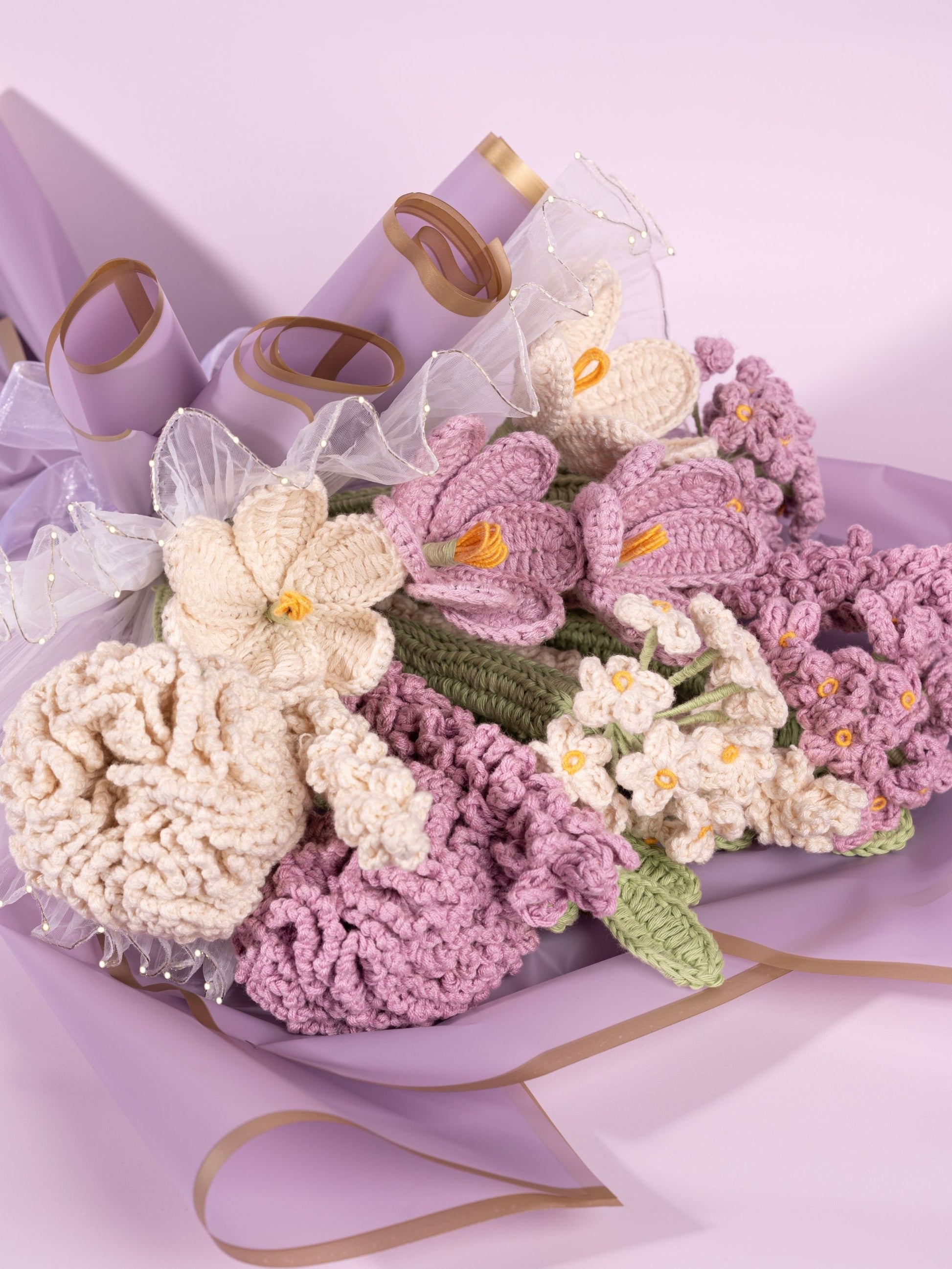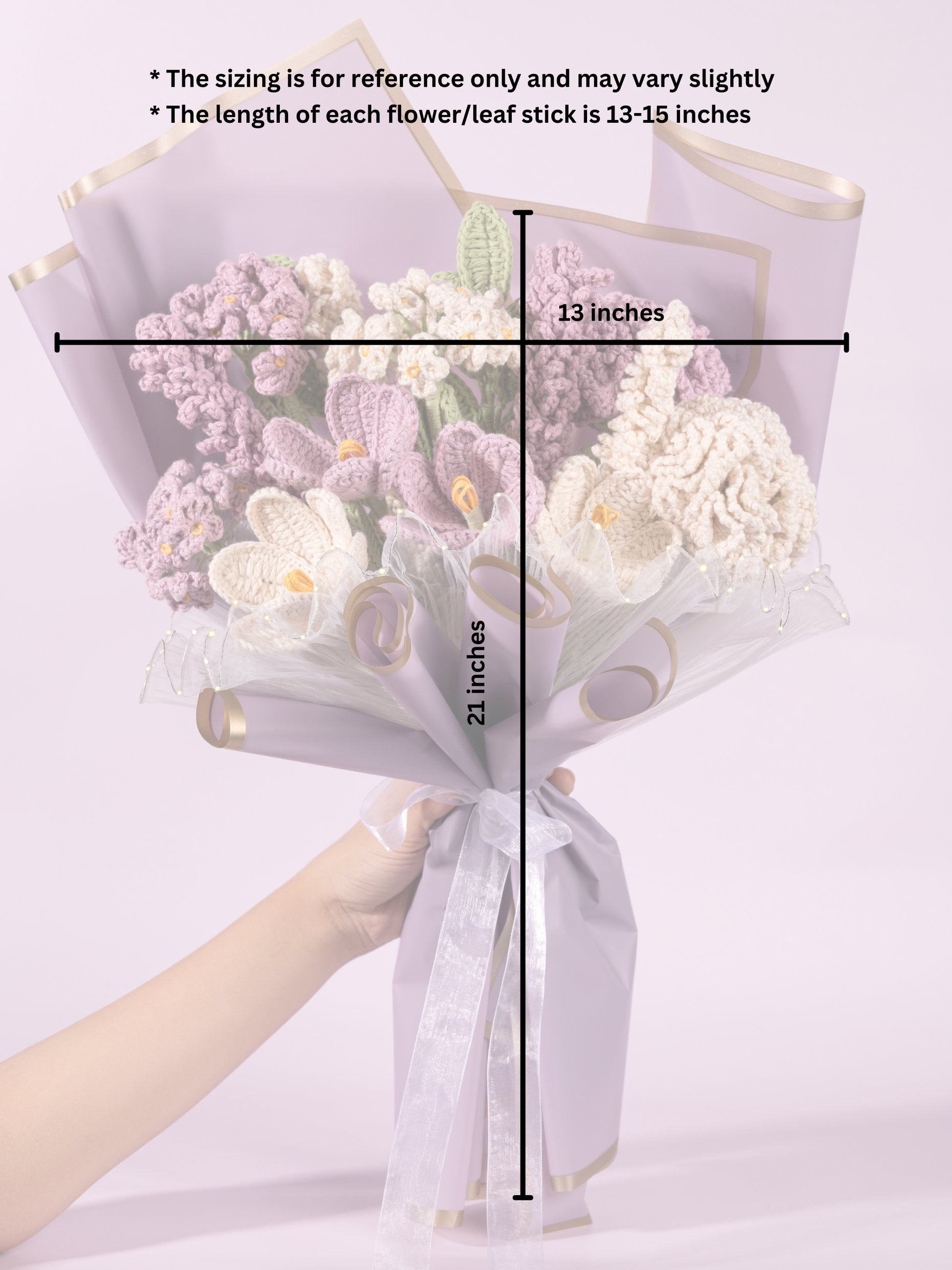 It contains: 4 tulips, 2 carnations, 3 bunches of forget me not, 2 lavender sticks and leaf sticks. All the sticks are 12-14 inches long.