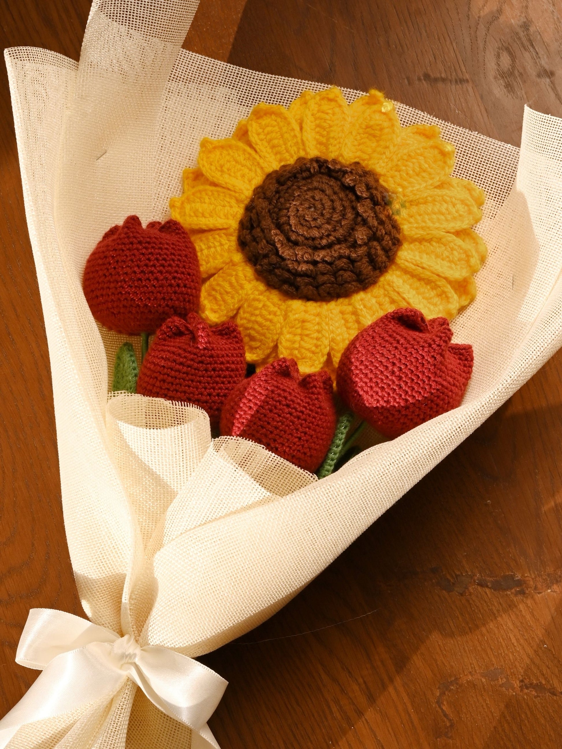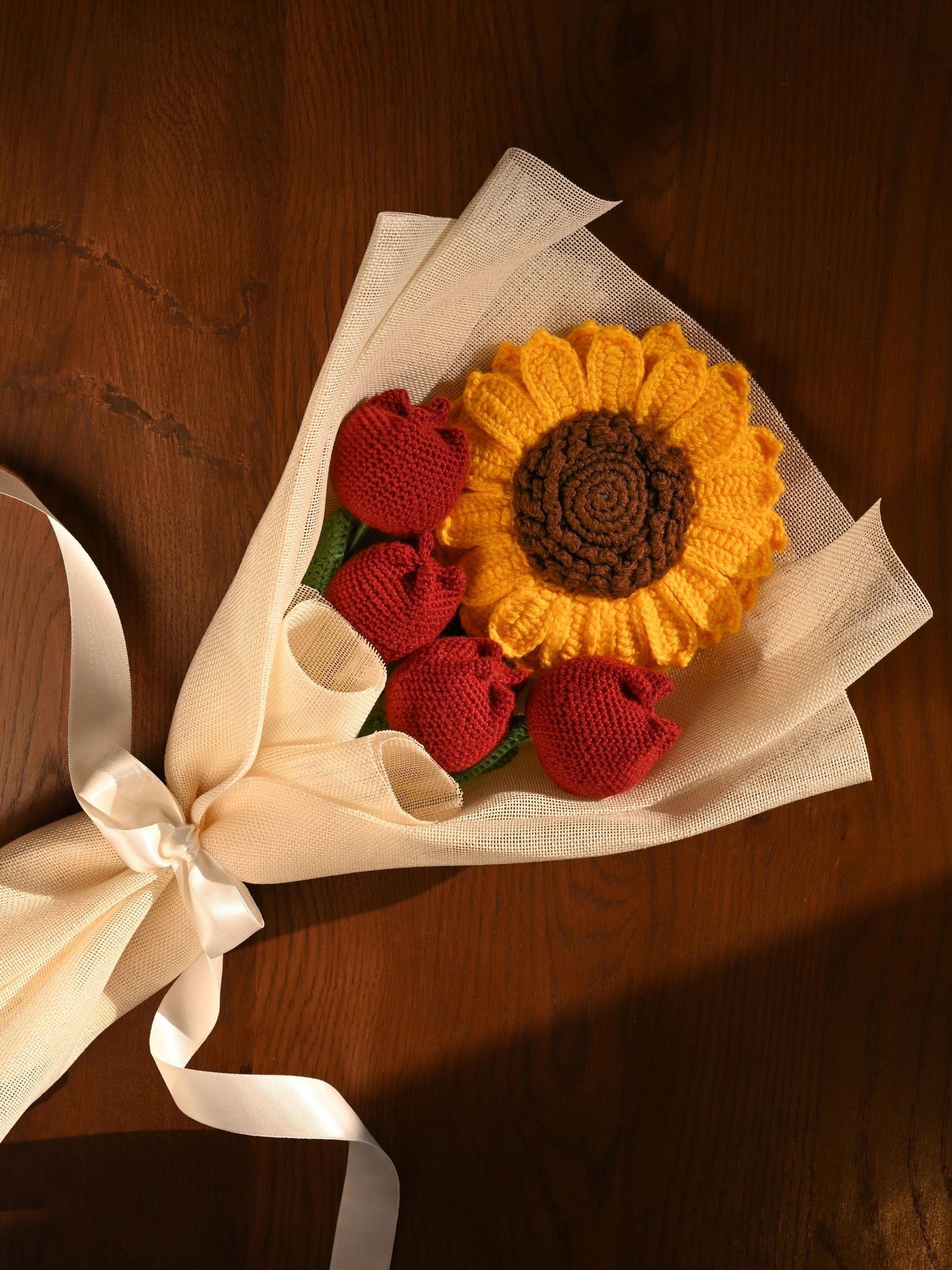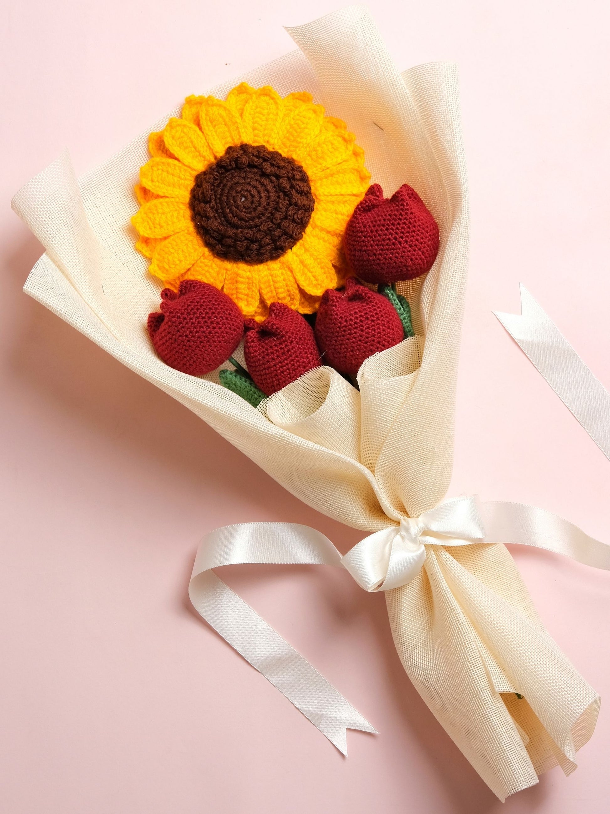 Autumn Crush brings together 1 sunflower and 4 maroon closed tulips, wrapped in rustic jute — a bouquet that feels like a crisp, beautiful fall day you’ll want to hold on to.