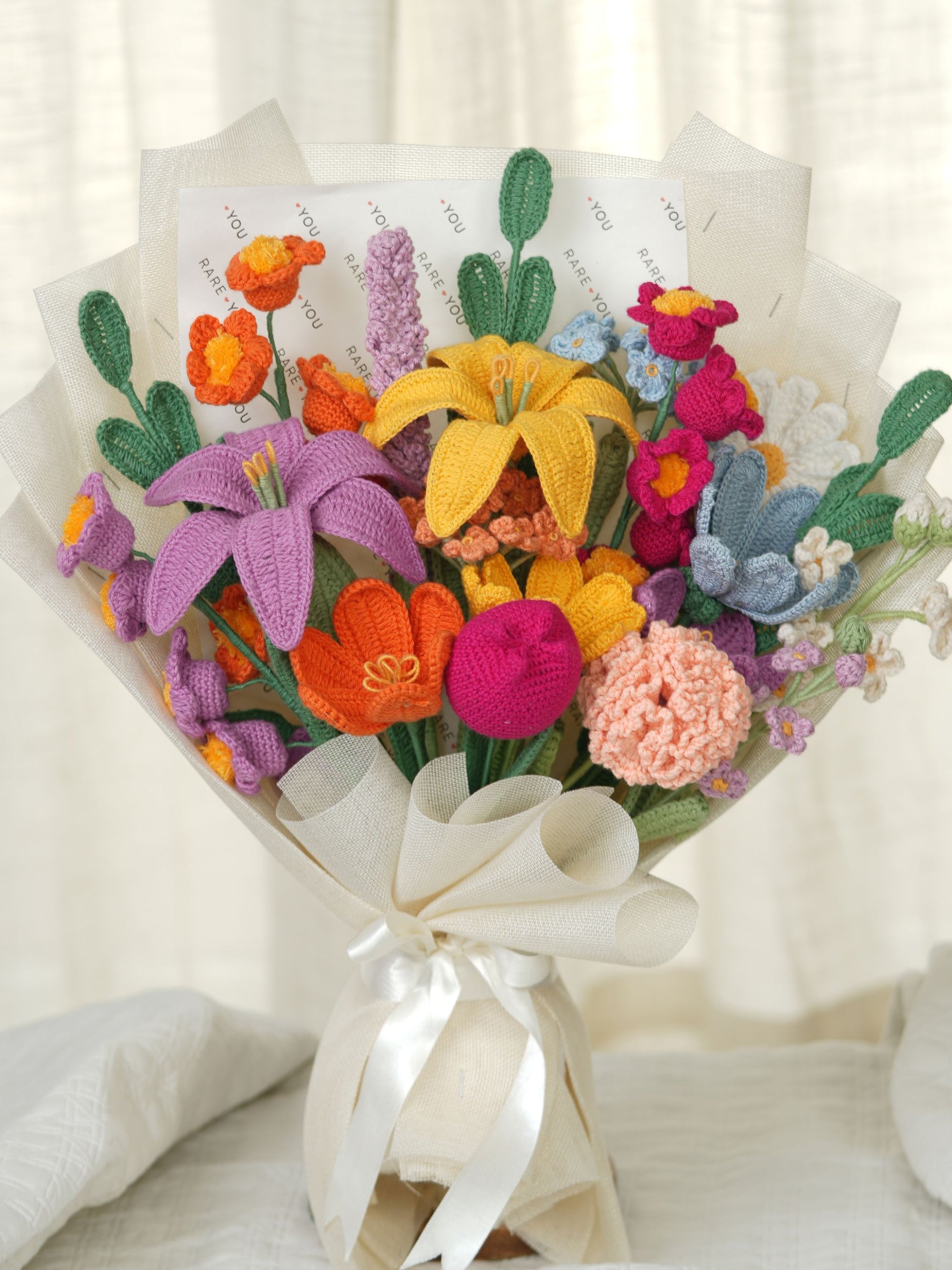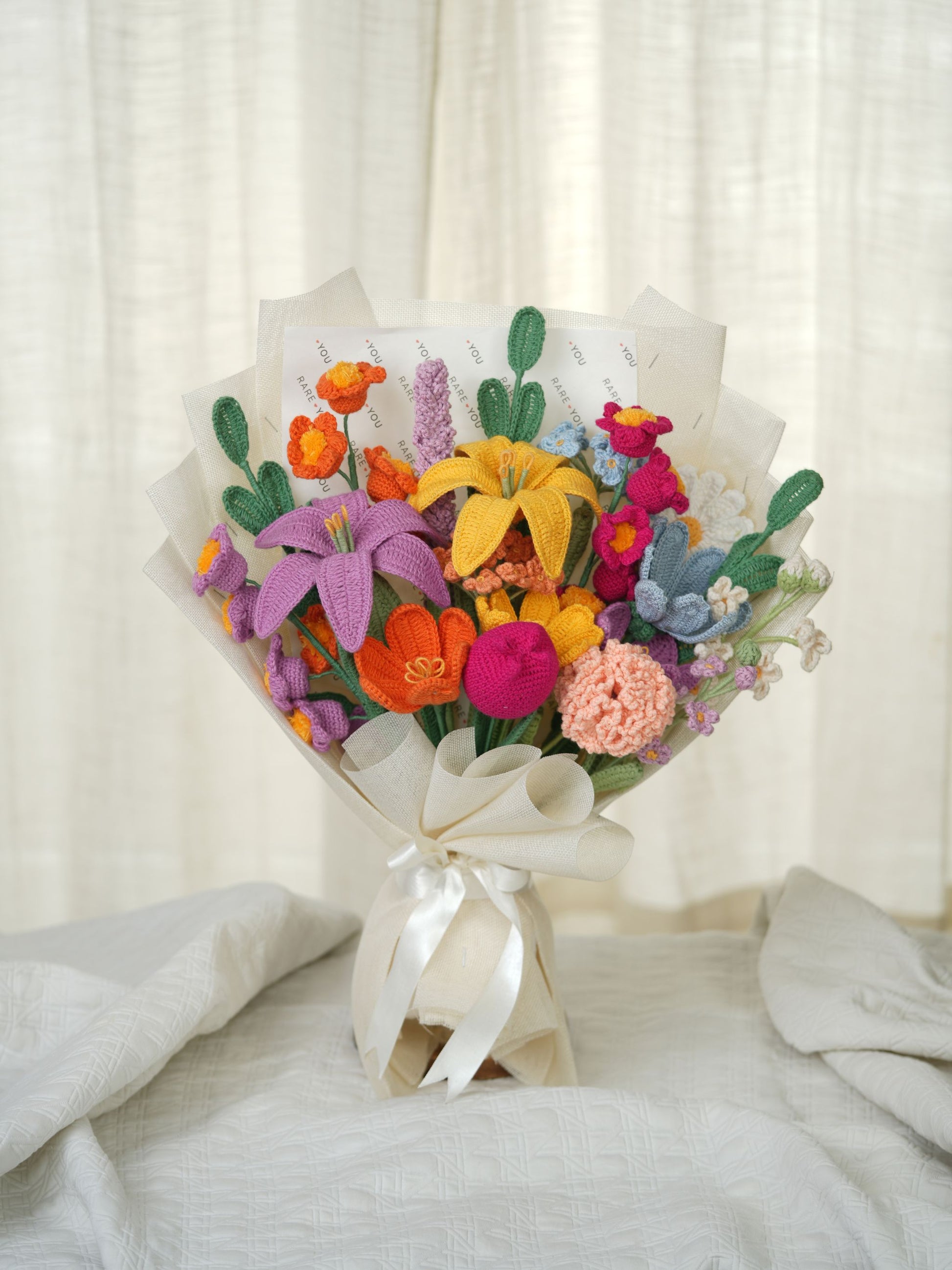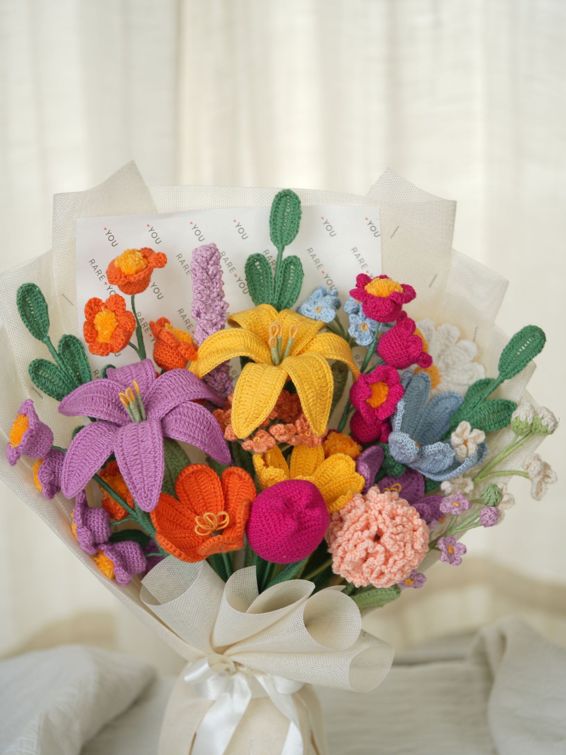 Bageecha is a medley of florals. It has 2 lilies, 3 lily of the valley, 2 open tulips and 1 closed tulip, 1 carnation, 2 gesang, 2 buds, 1 daisy, 2 forget-me-nots, 1 lavender, 3 leaves. Every stem adds its own charm, creating a bouquet that feels like a walk through a blooming garden. Colorful, abundant, and full of life; it’s made for moments that deserve a little extra magic.