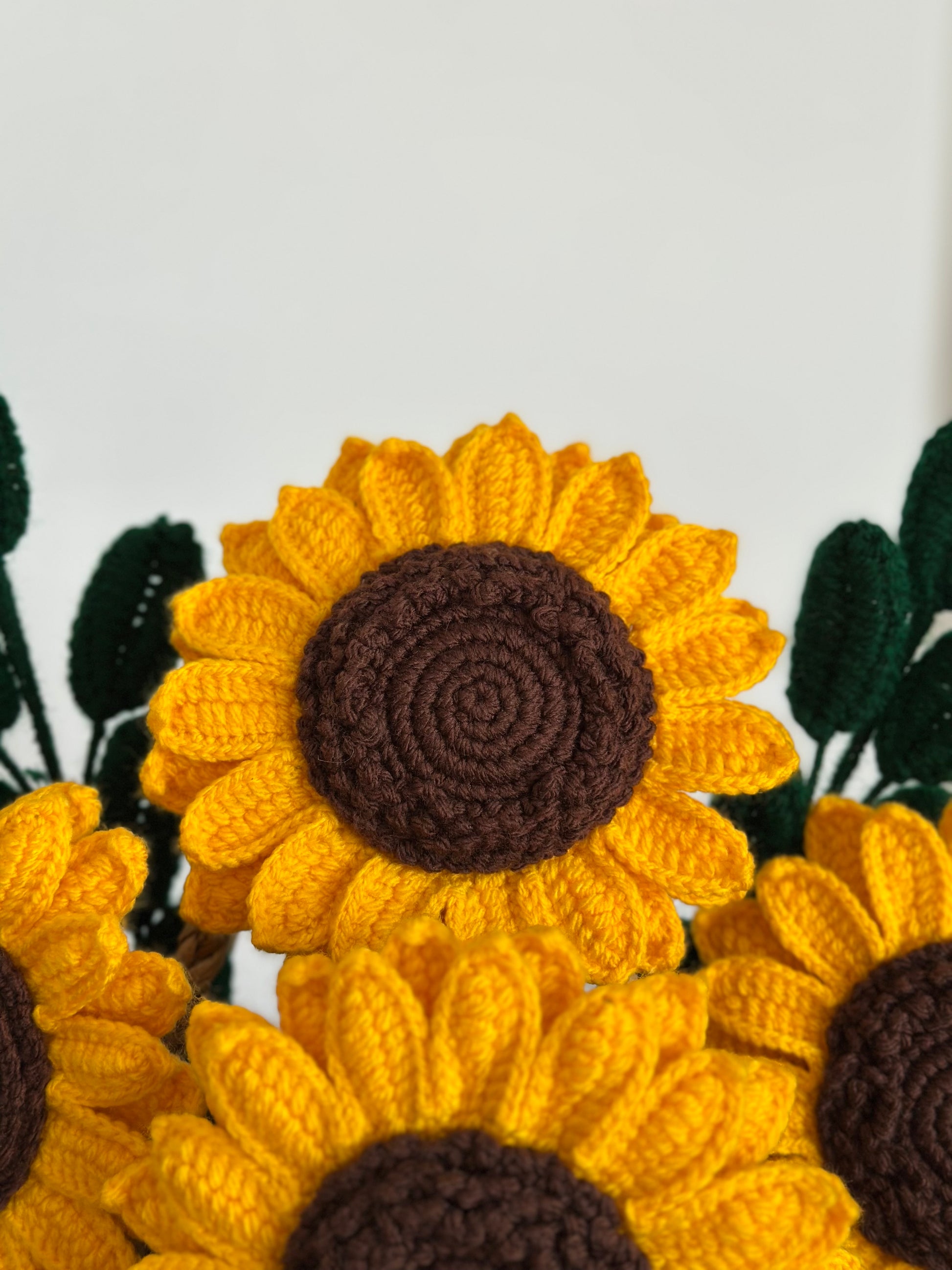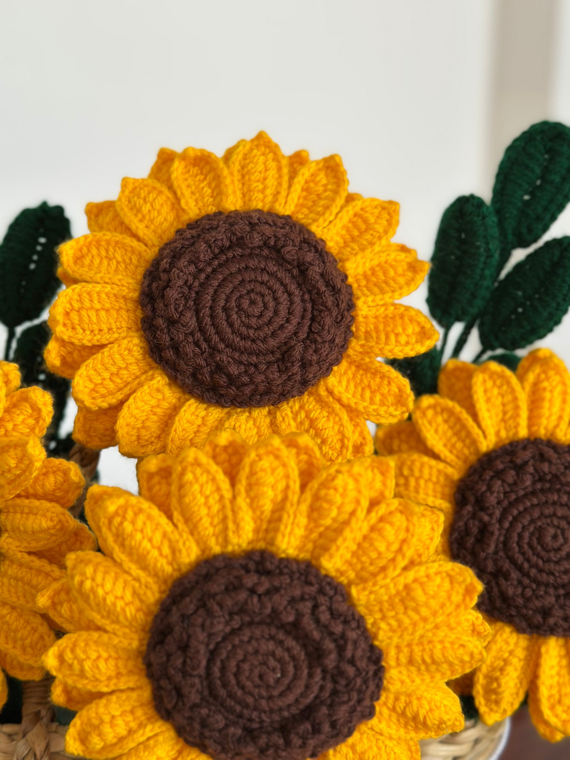 This is a basket full of 4 double-petaled sunflowers and 4 leaf sticks. The basket also has a foam to hold the flowers in place.