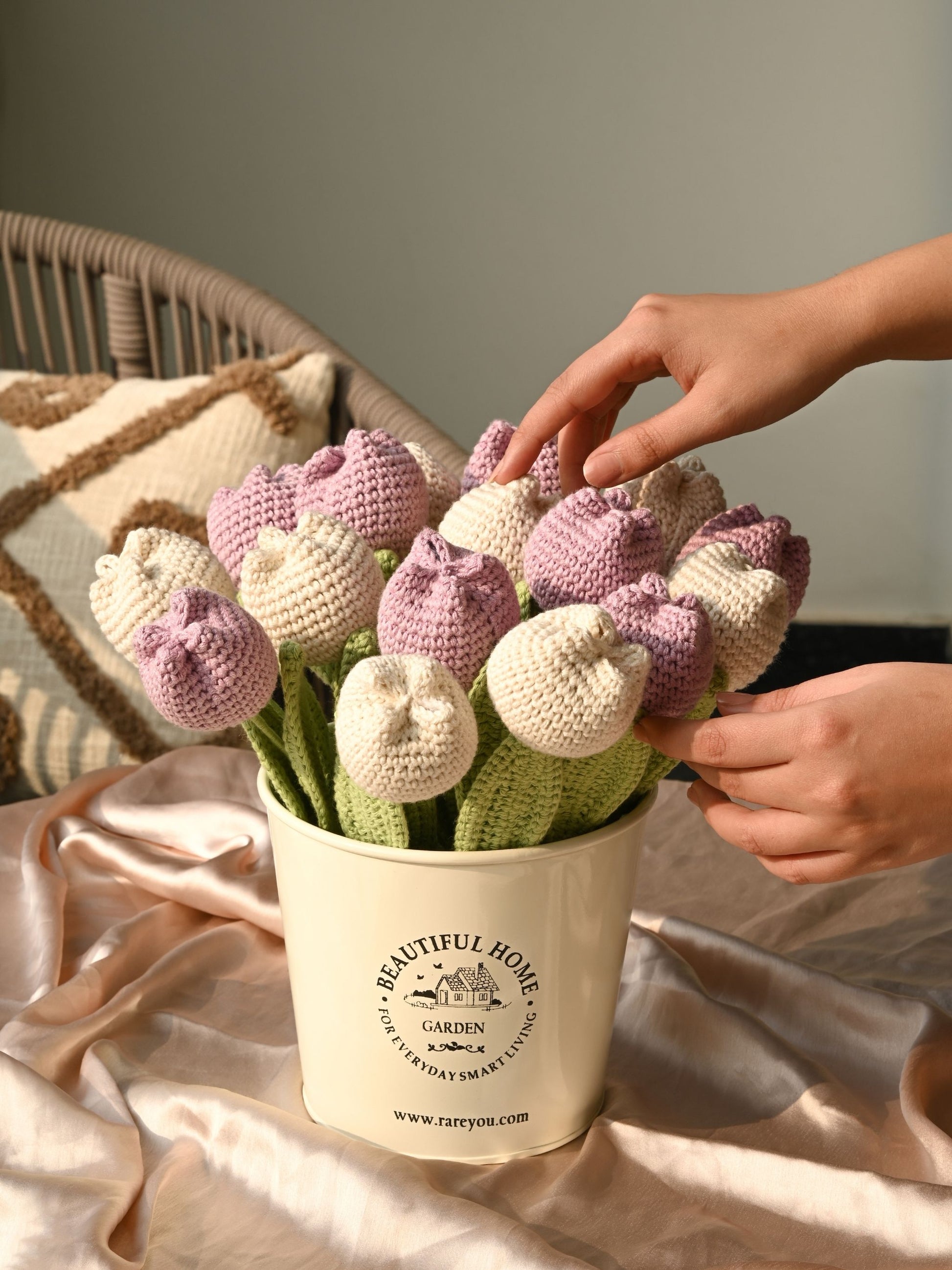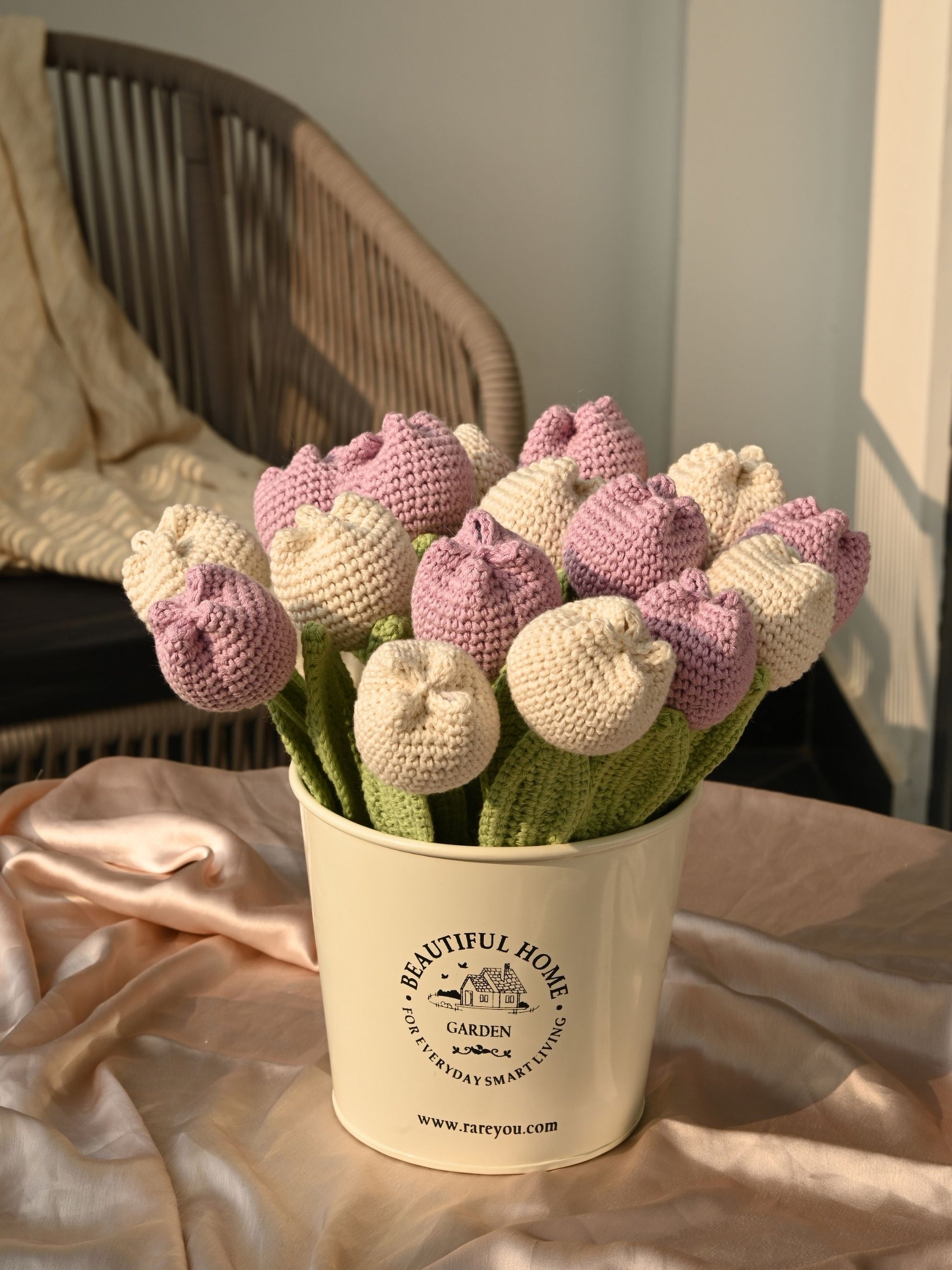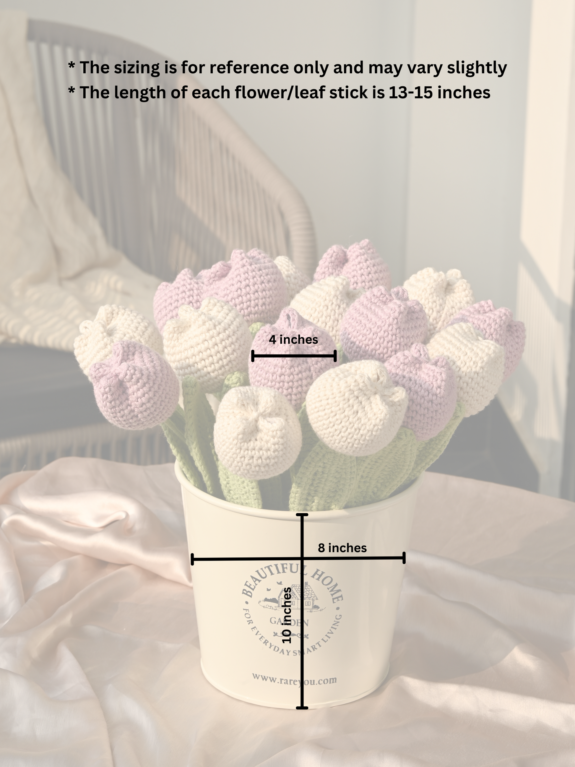 A beautiful bunch of 16 tulips in lilac and pink colour which comes along with a steel white bucket.