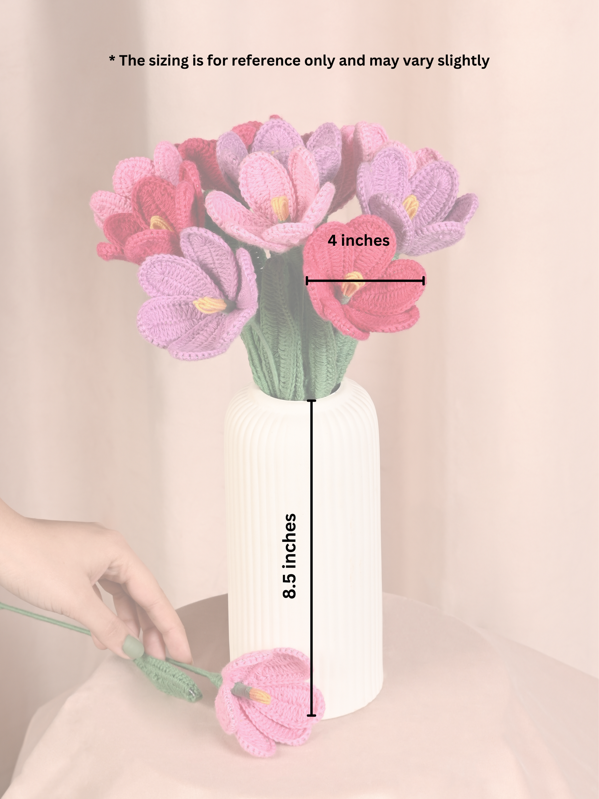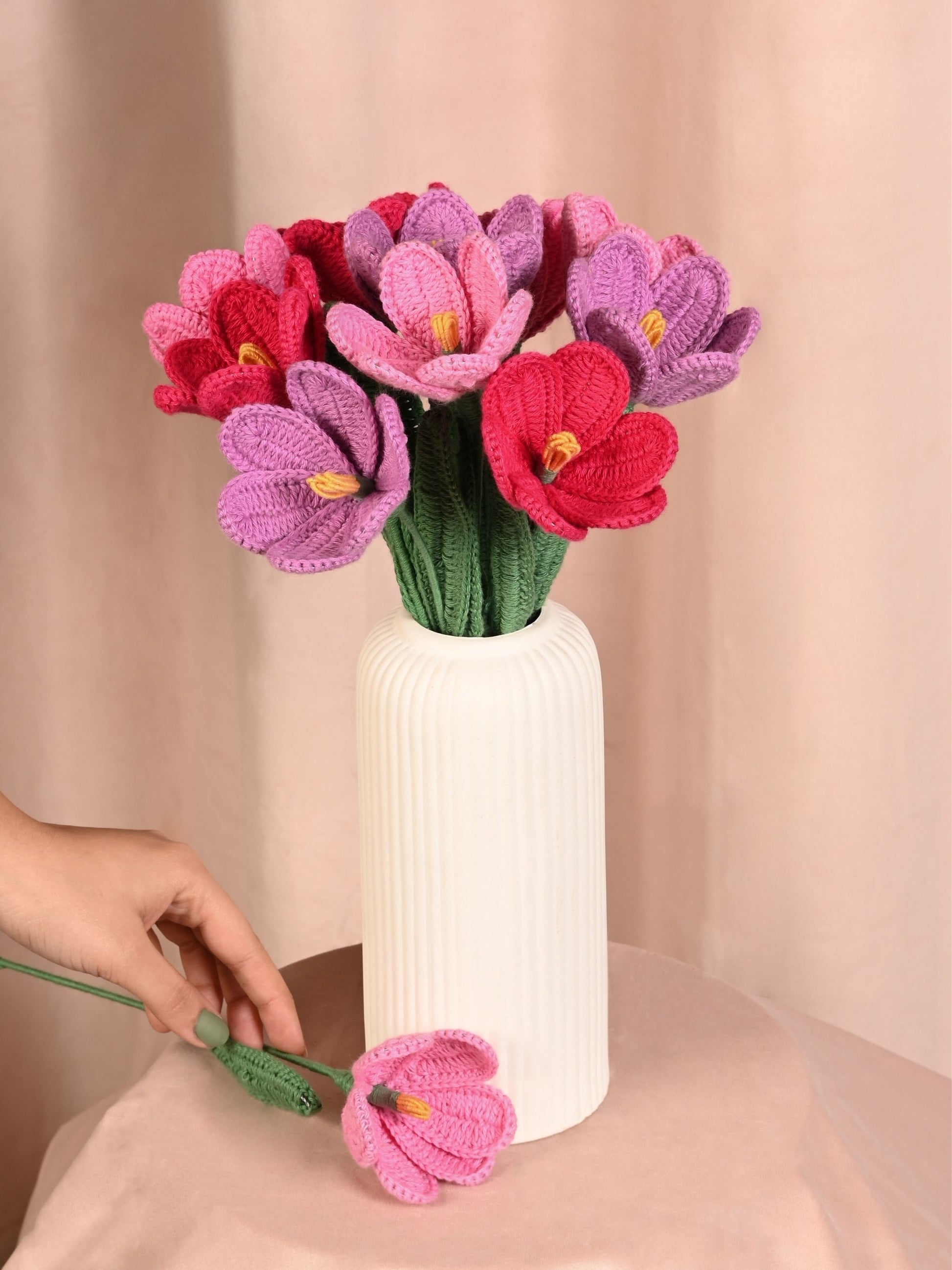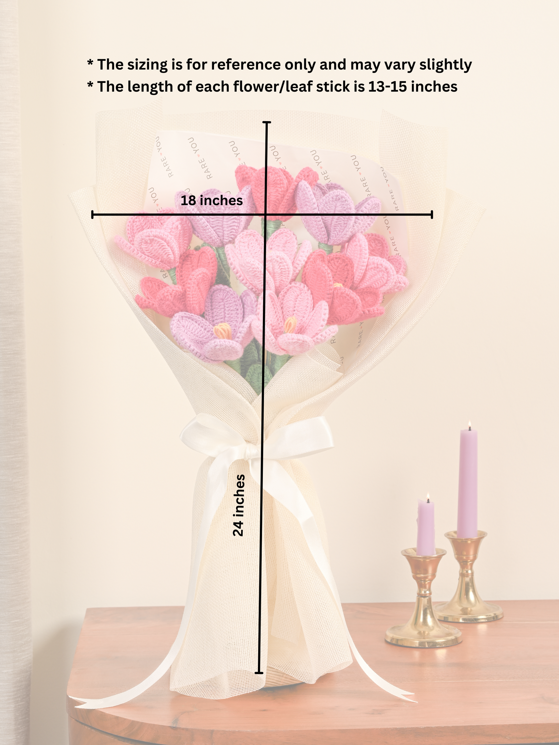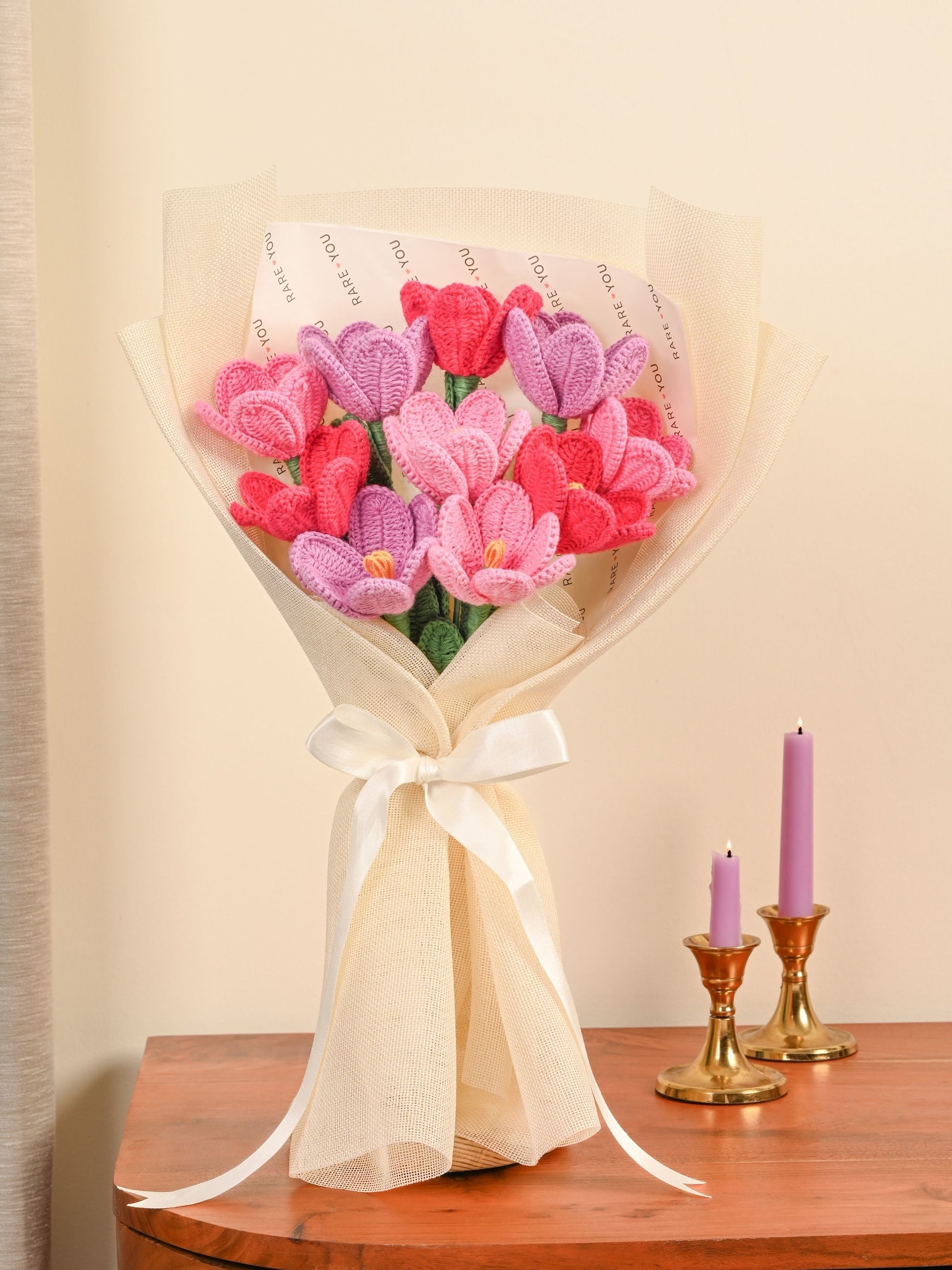 Candy Crush is a lively mix of 3 lilac, 3 hot pink, and 4 pink open tulips, wrapped in rustic jute. It’s a sugar rush of colour — playful, pretty, and ready to steal hearts.