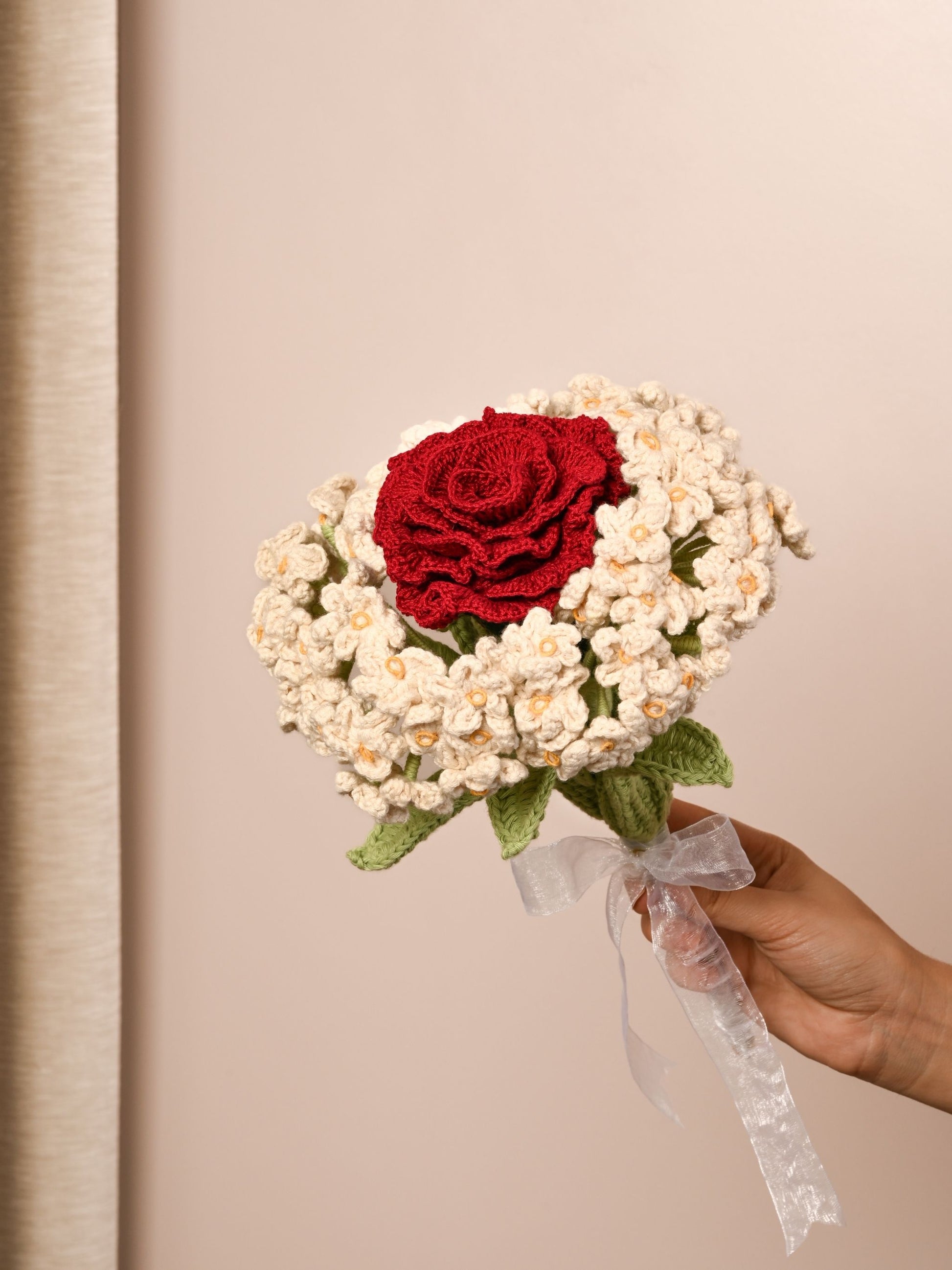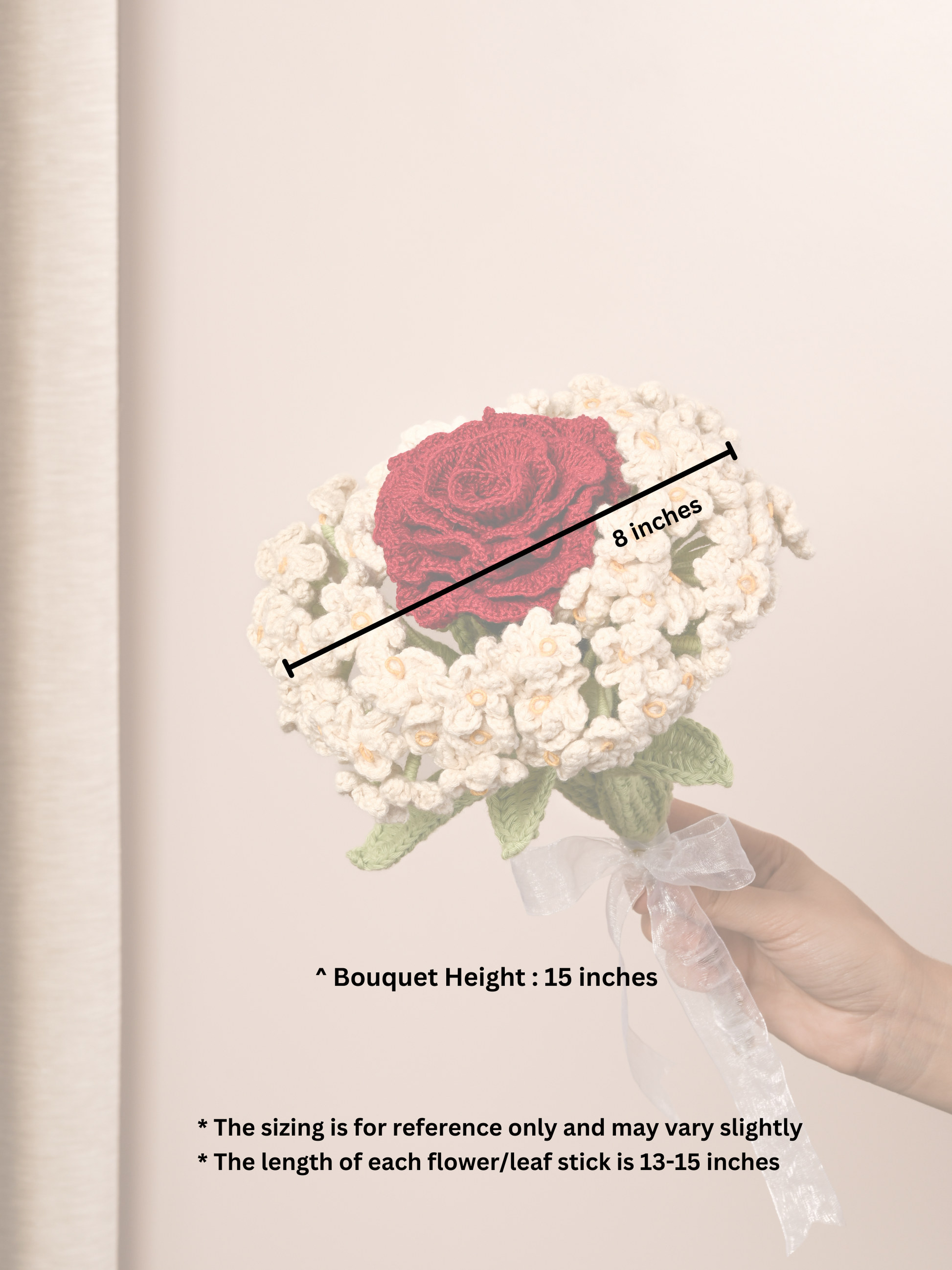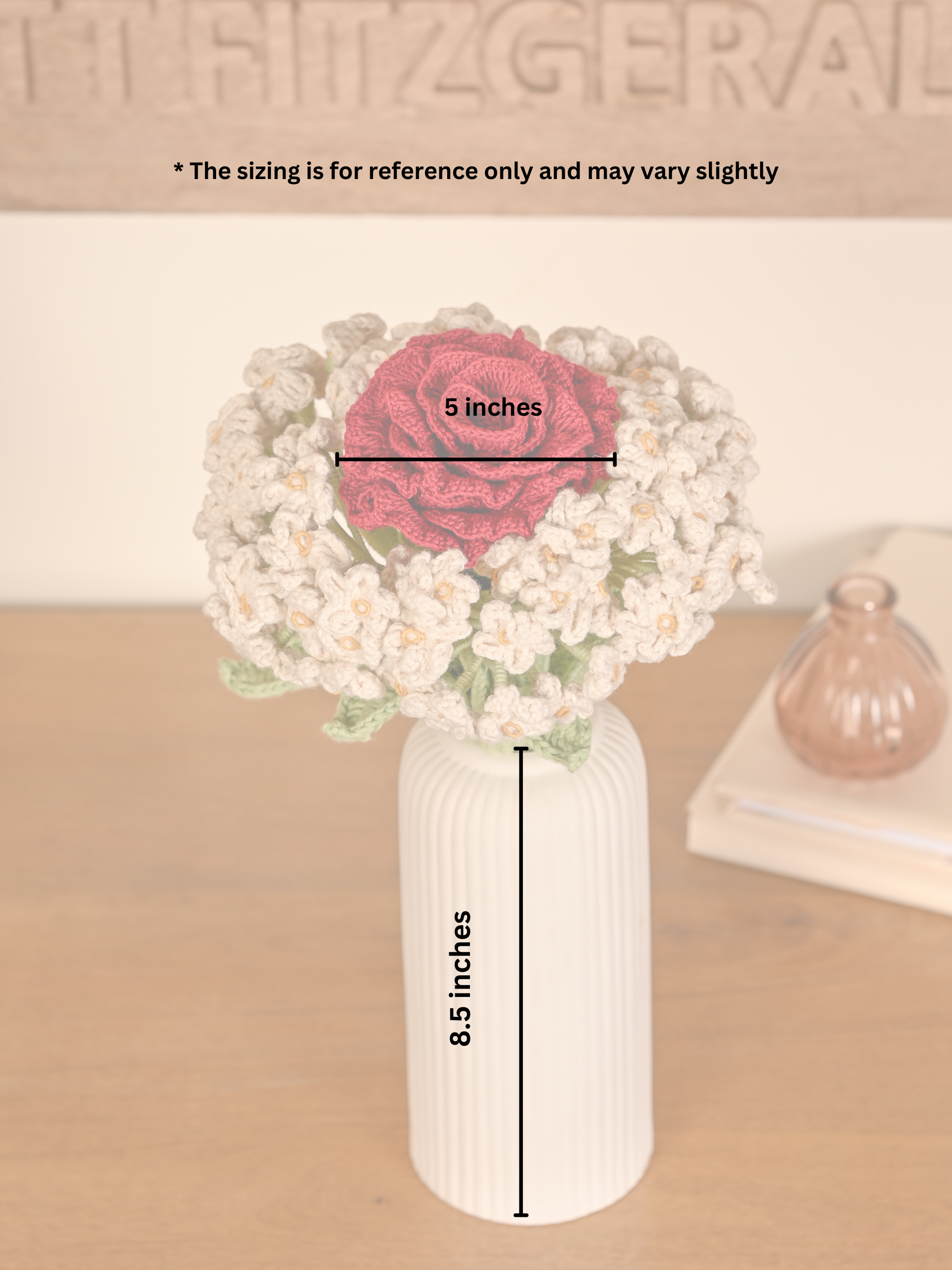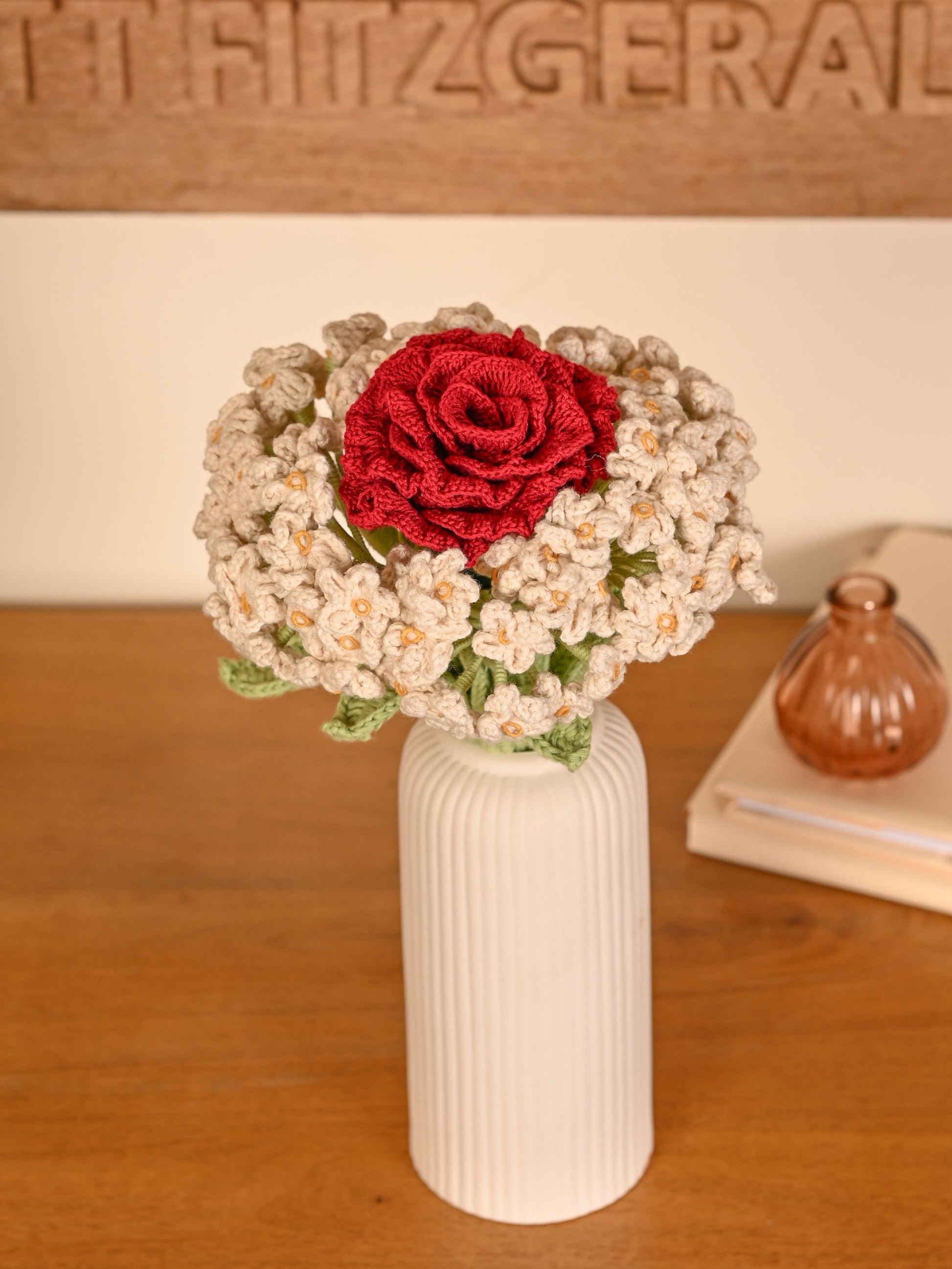 One rose surrounded by 6 forget-me-nots, signifies a form of love that is meant for eternity!
