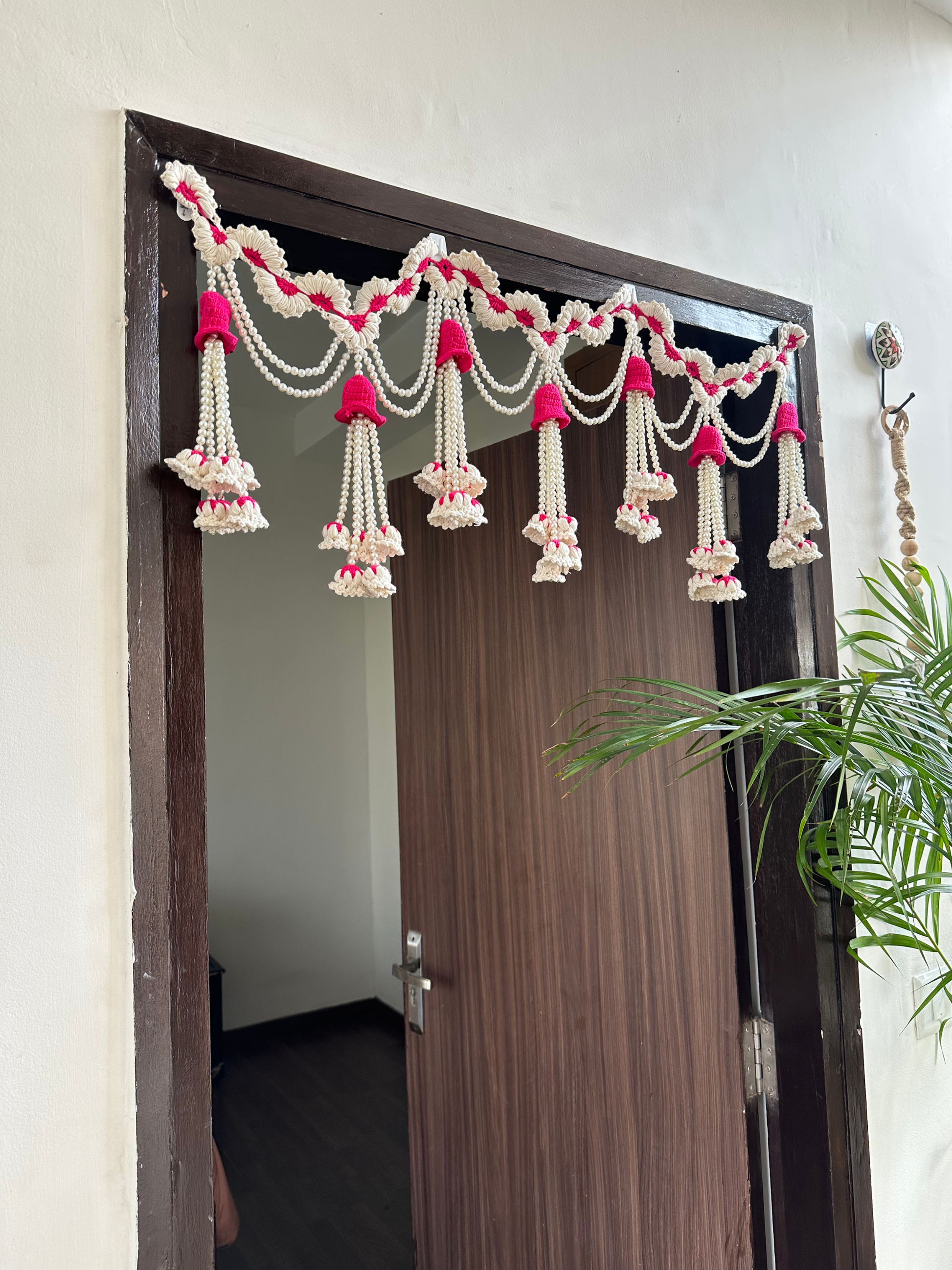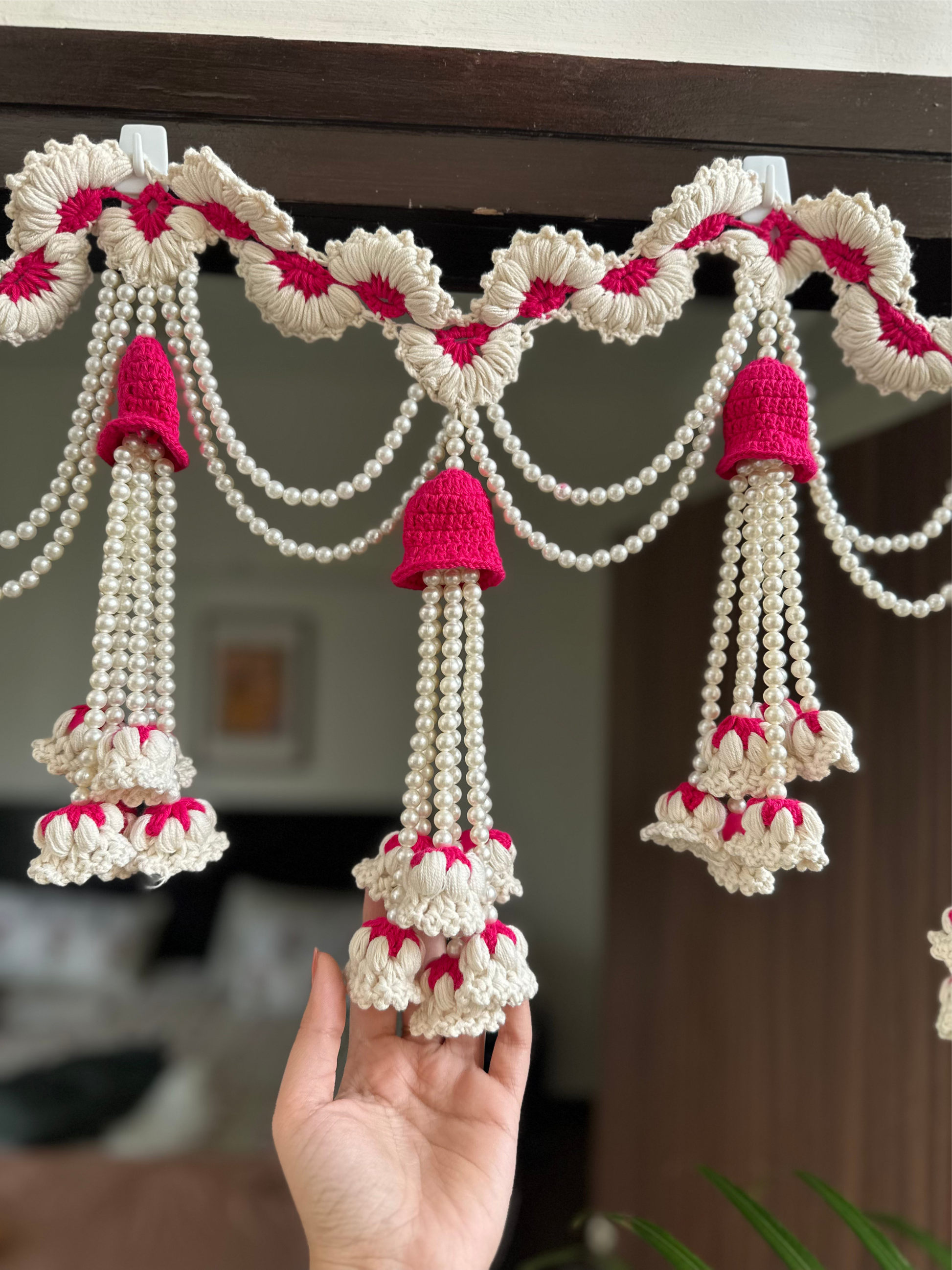 This is for those who love traditional festive torans but want to avoid plastic flower ones. I have tried to incorporate bells to add a festive Indian touch. I love how the pearls complement the entire piece. We have very few in this style, too. Ideal for a 3 ft door.