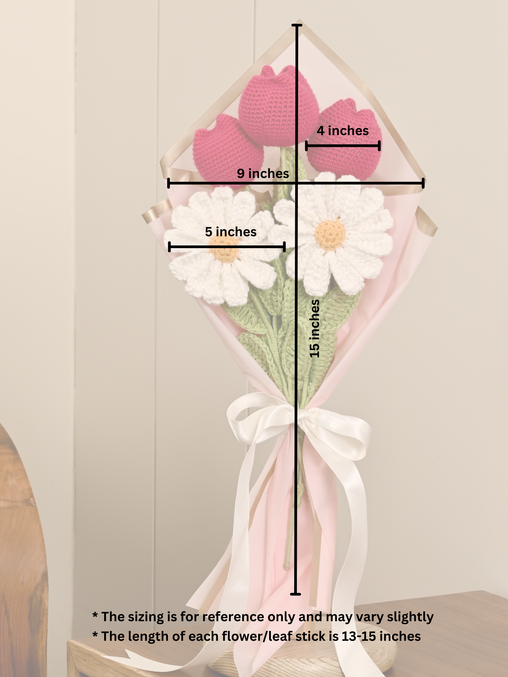 Oh, this amazing combination screams beauty. It comes with 3 hot pink tulips and 2 daisies. The subtle pink paper enhances the beauty of it. Send this to someone you love and you’ll make their day. Or get it for yourself and make your day. Each stick is 13 inches long.