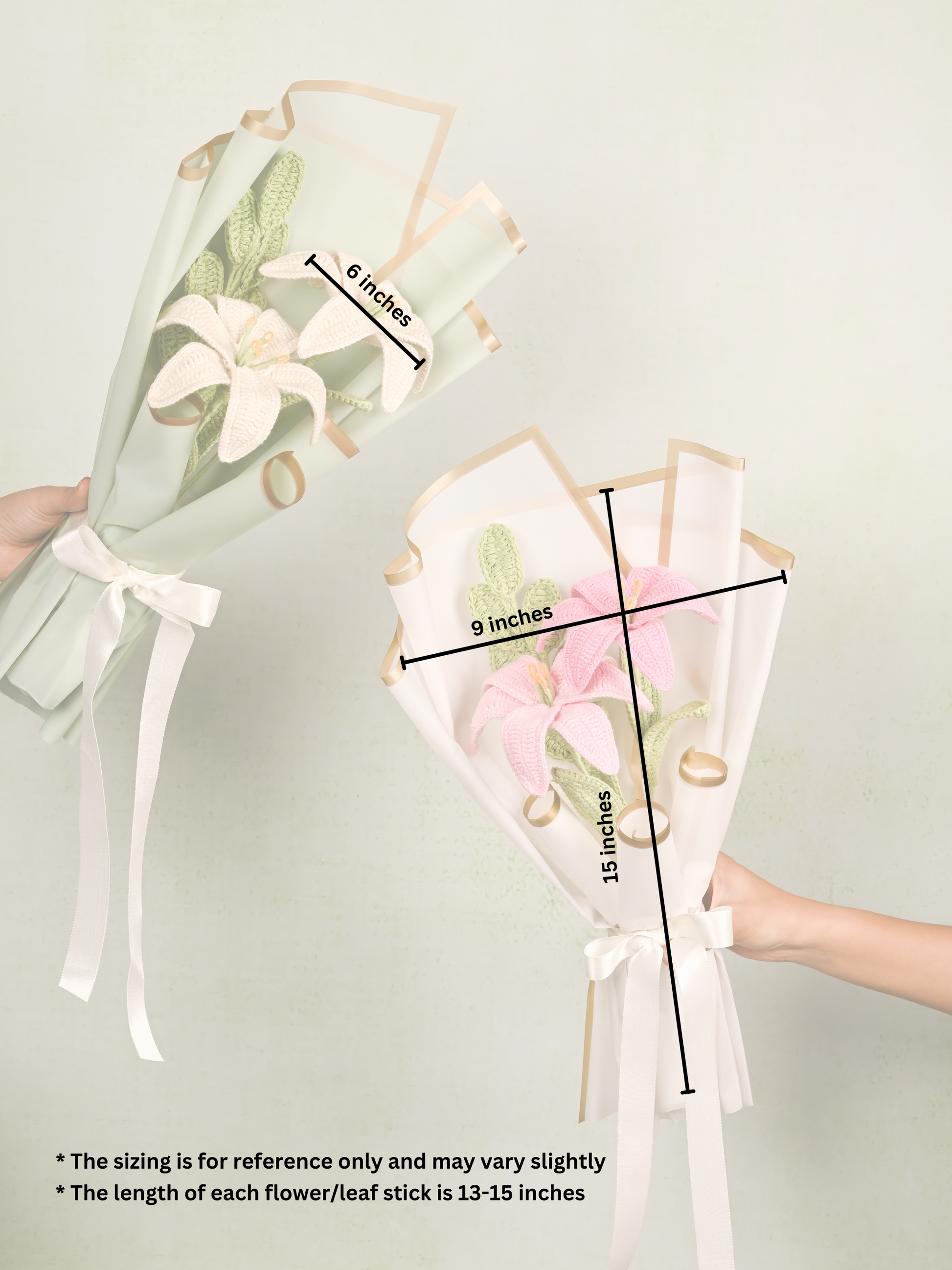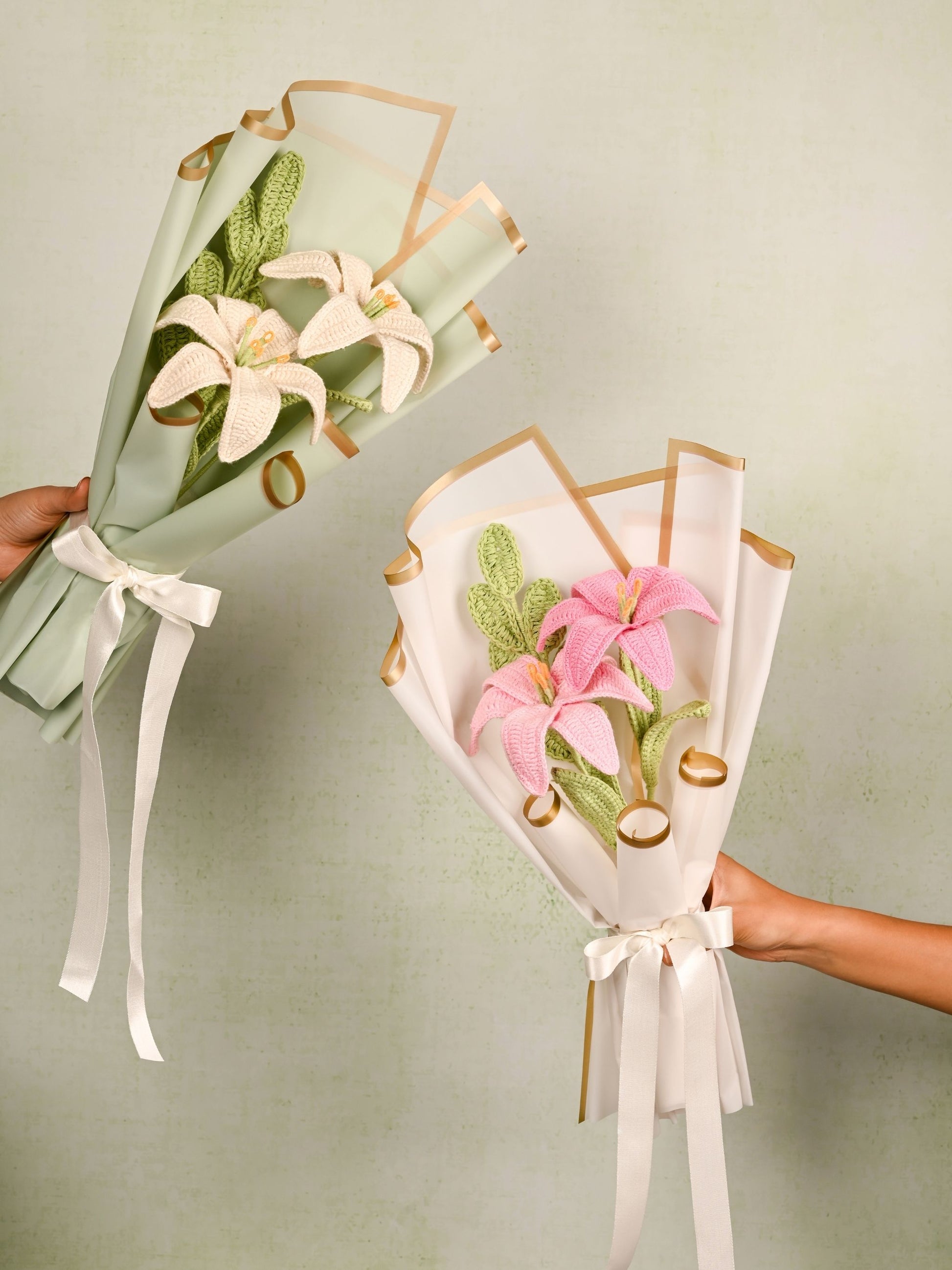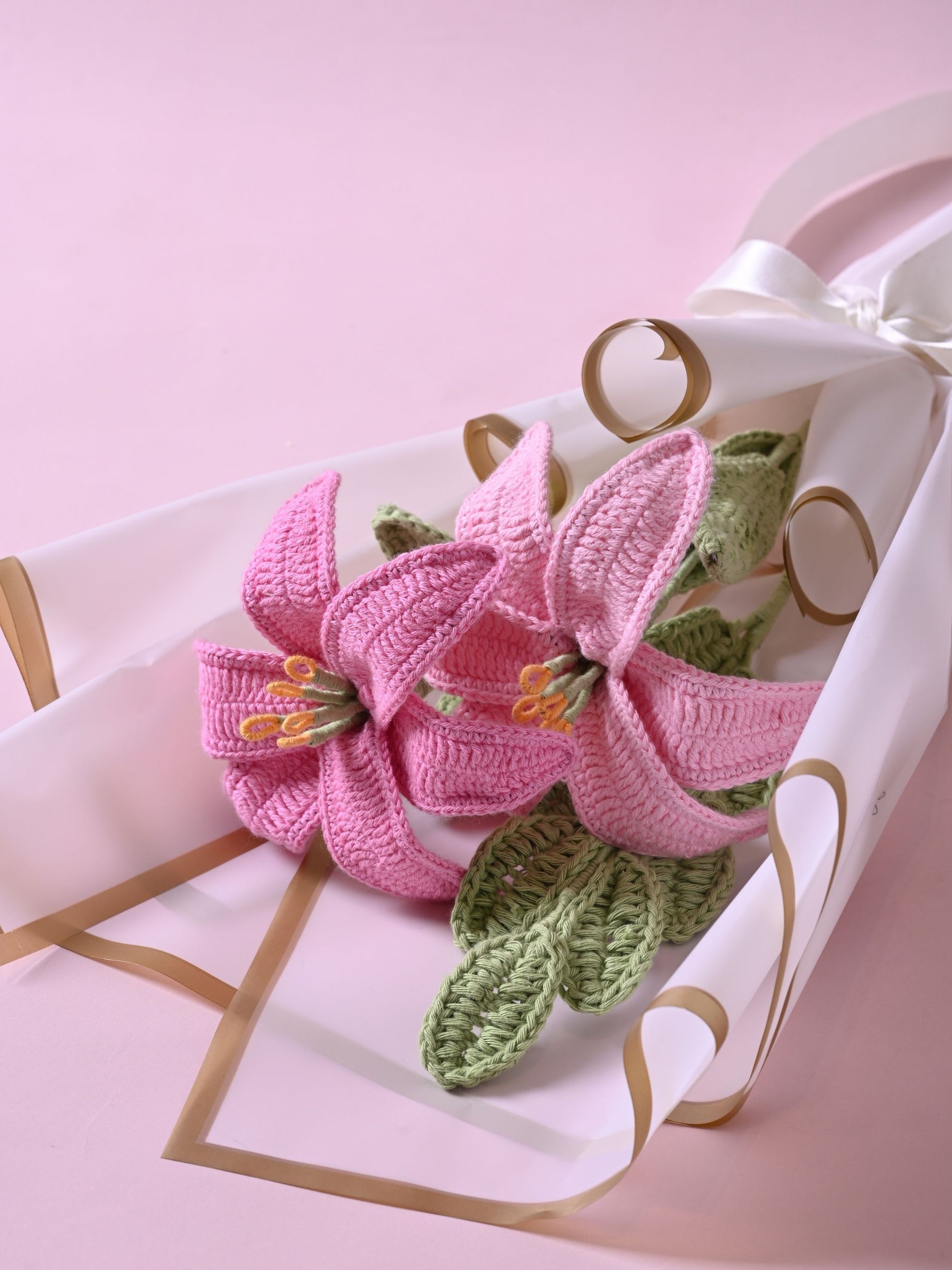 "Lily Light" captures the serene beauty of white lilies in each carefully crocheted petal. This bouquet, handcrafted with attention to detail, embodies purity and tranquility. Perfect as a gentle décor piece or a thoughtful gift, it brings a touch of everlasting grace to any setting.