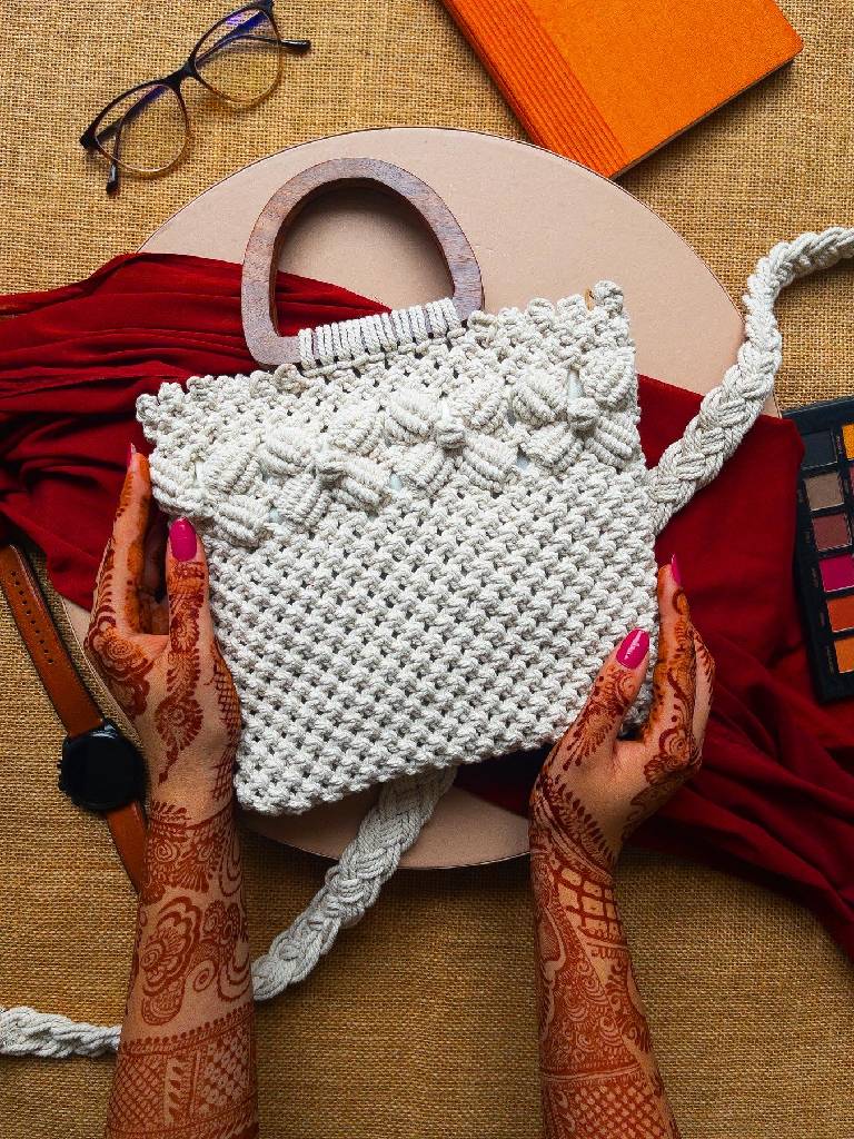 Our Macrame Baguette with Polished D Shape Handles and Intricate Flower Design is a true work of art. Handcrafted by skilled artisans, this bag features a unique flower pattern that adds a touch of bohemian elegance to the design. The polished D-shaped handles provide a comfortable grip, while the spacious interior can hold all your essentials. Made with high-quality cotton macrame, this bag is both durable and stylish, making it the perfect accessory for any occasion. Whether you're headed to a summer festival or a night out with friends, this bag is sure to turn heads.