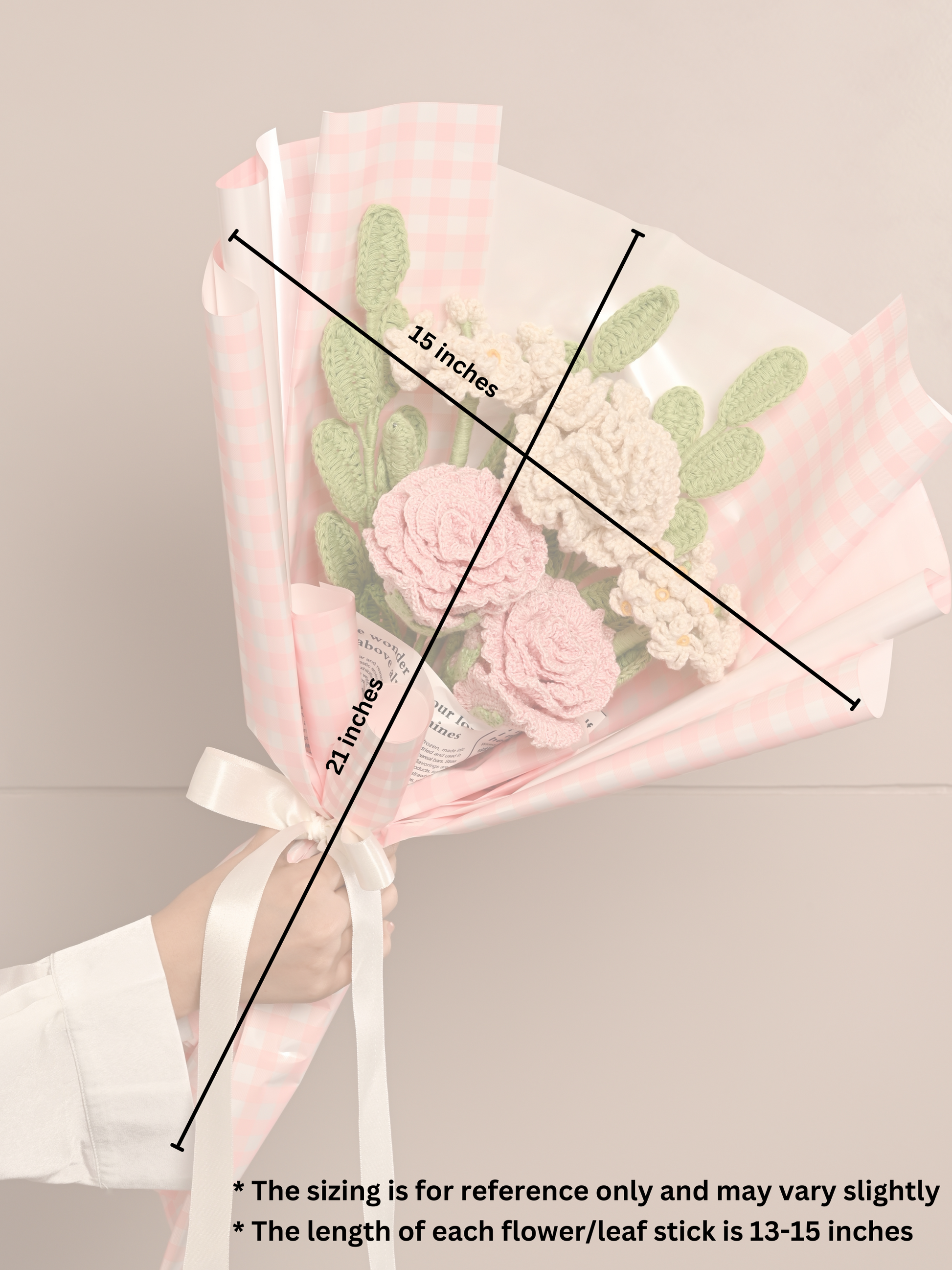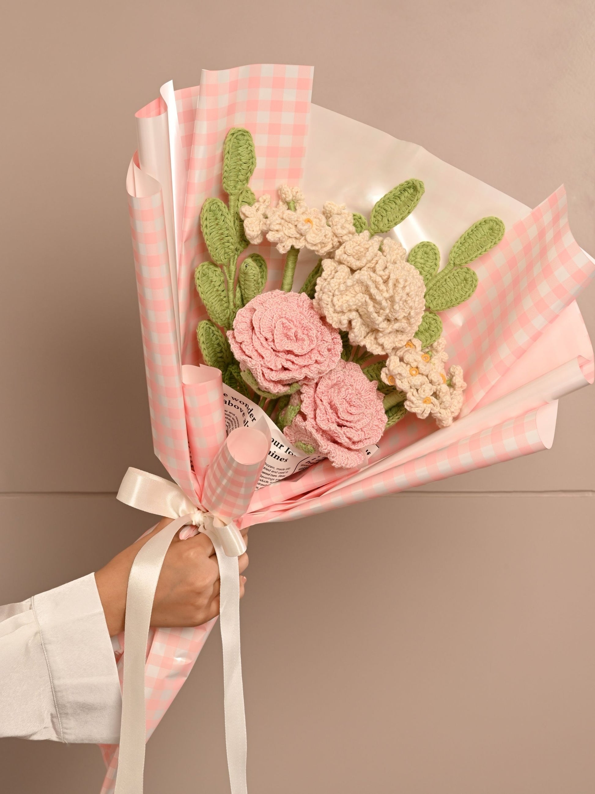 Rose Symphony brings together pink roses, delicate white forget-me-nots, a white carnation, and leafy greens, all wrapped in baby pink gingham. It’s a pastel dream for lovers of elegance and quiet beauty.