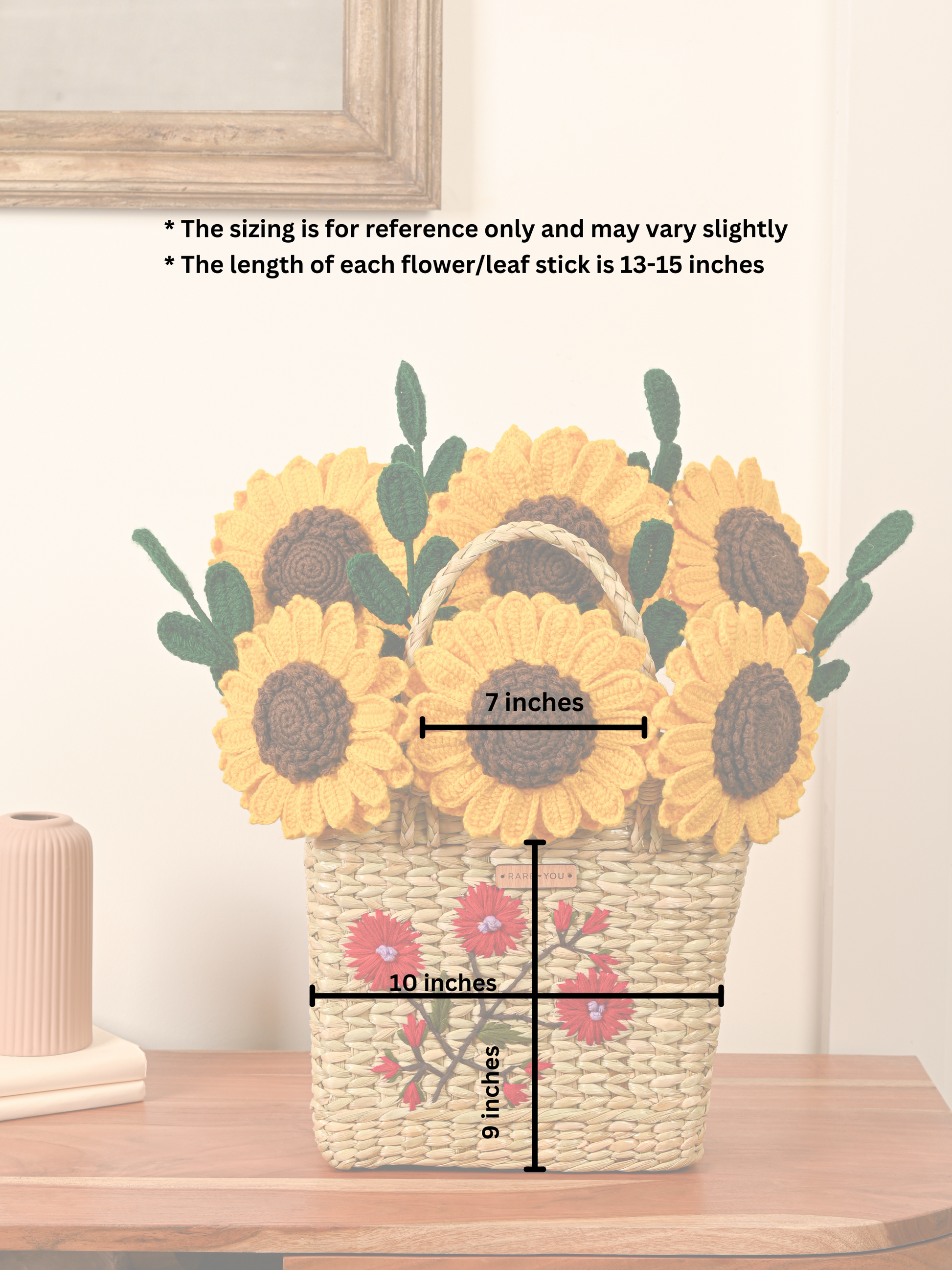 It contains: 6 big sunflowers, 4 leaf sticks, an embroidered cane basket and foam to arrange the flowers.