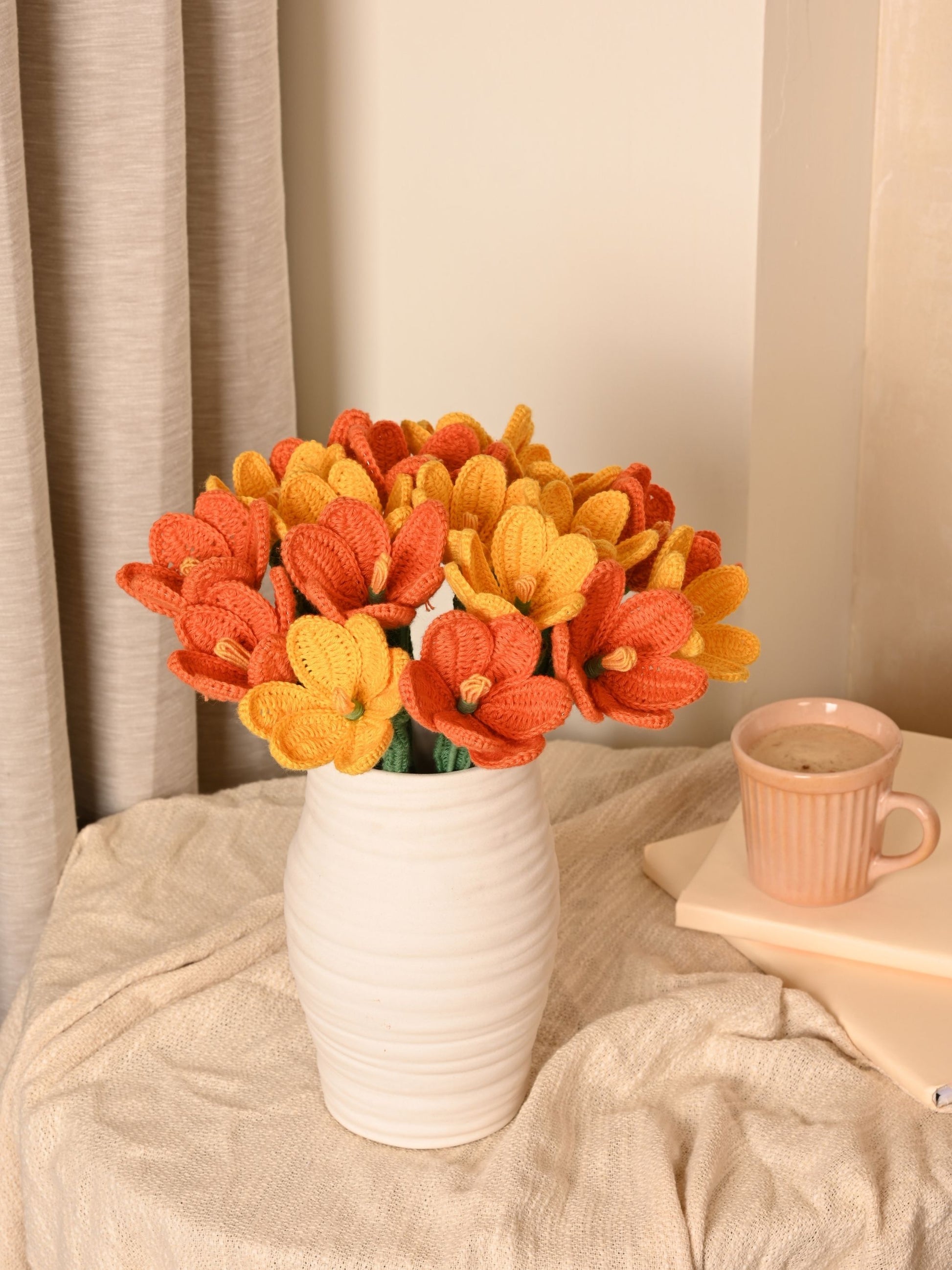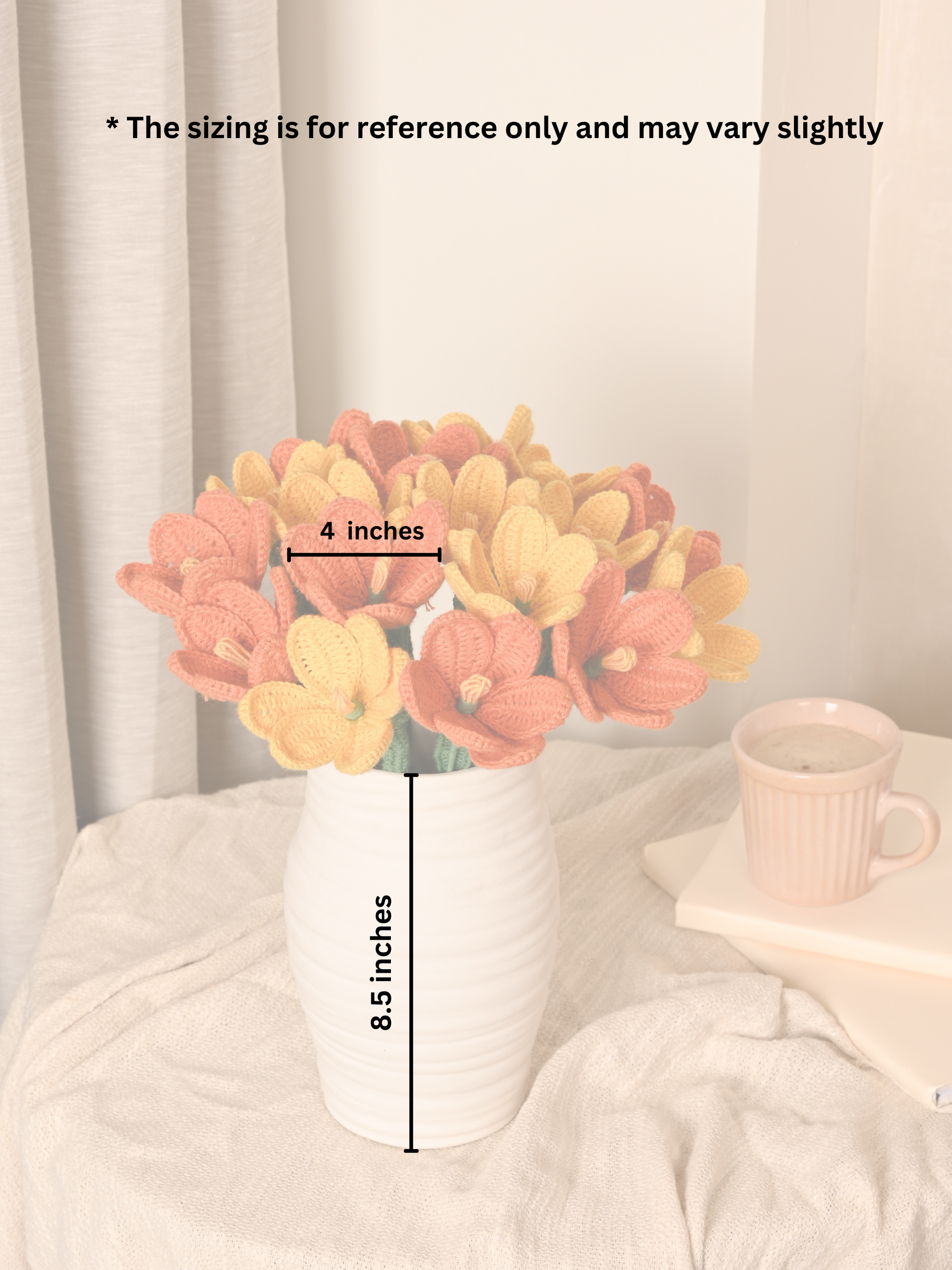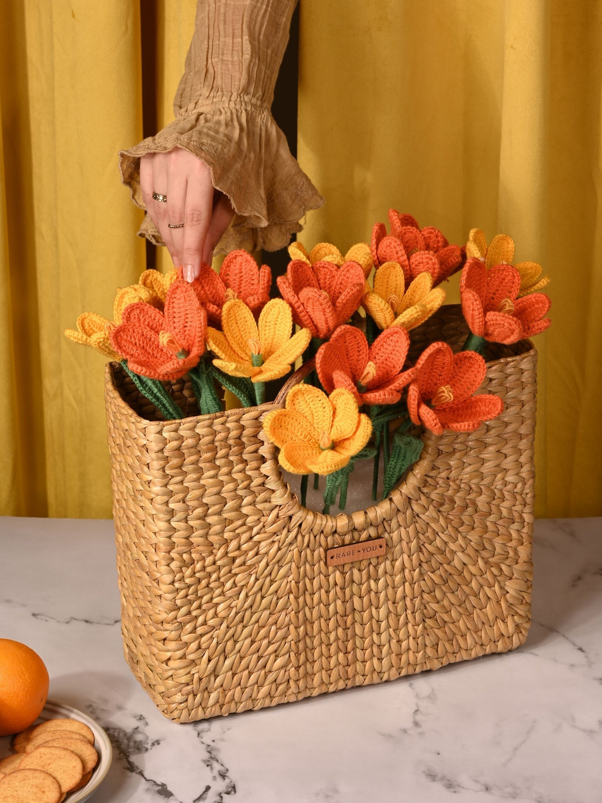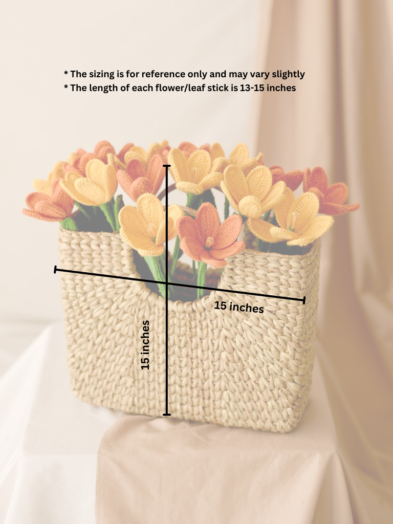 This is a stunning set of 15 tulips in vibrant yellow and orange, creating the feel of a mini garden inside a basket! This charming arrangement instantly brightens any space, adding a touch of warmth and elegance wherever it’s placed.