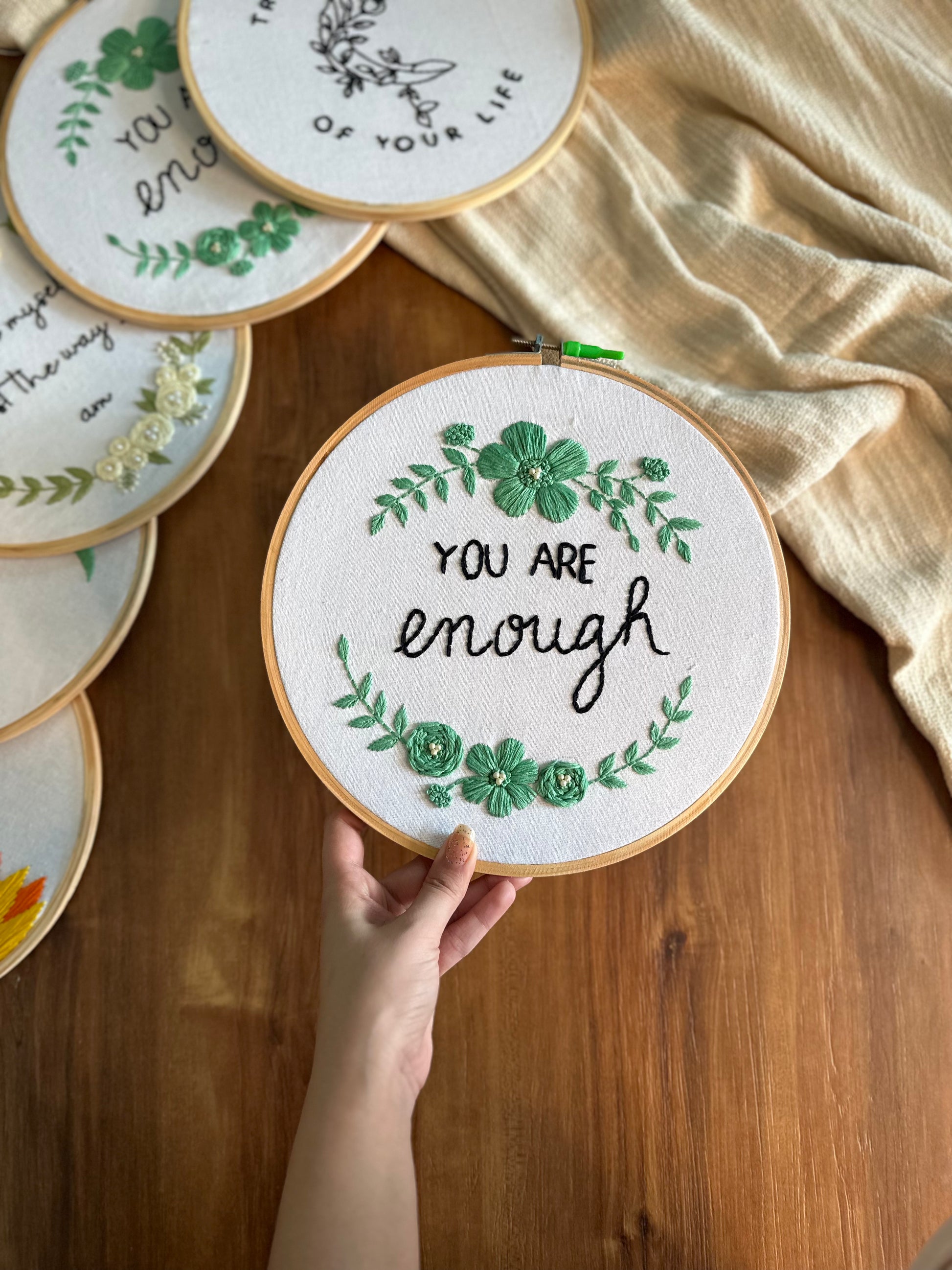 Embroidery hoops with some affirmations on them! What could be more thoughtful! These hoops are done on 10” embroidery frames and each stitch has been carefully crafted to achieve magic on fabric.